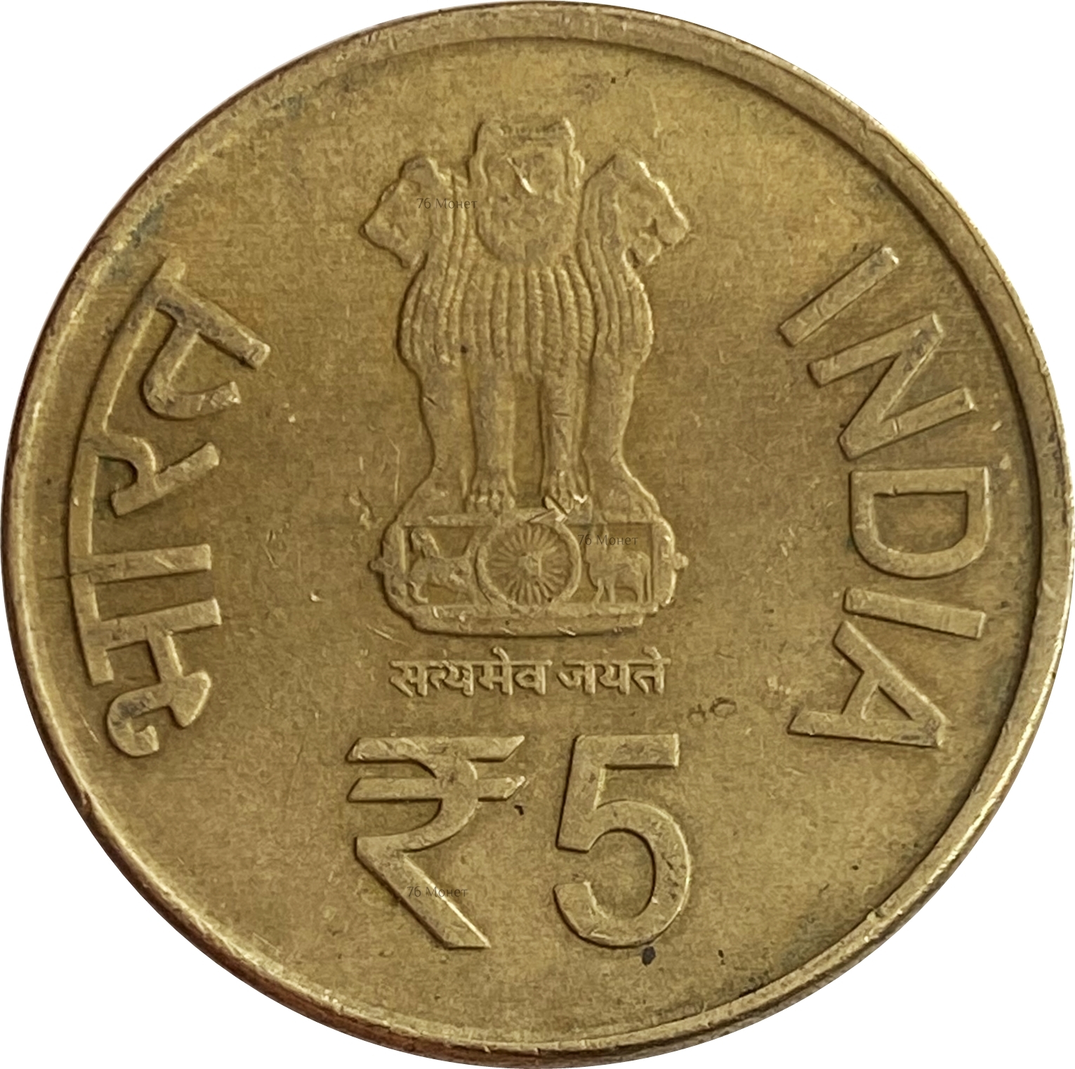 Реверс: по центру монеты расположен государственный герб Индии. Под ним указан номинал: "5". По бокам надписи: слева на хинди - "भारत", а справа на английском - "INDIA".