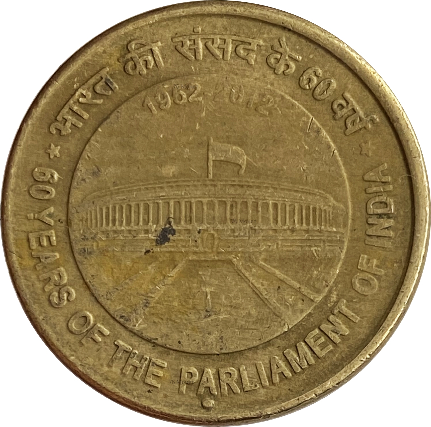 Аверс: в центре расположено здание парламента Индии. Вдоль канта надписи: "60 YEARS OF THE PARLIAMENT OF INDIA / भारत की संसद के 60 वर्ष".