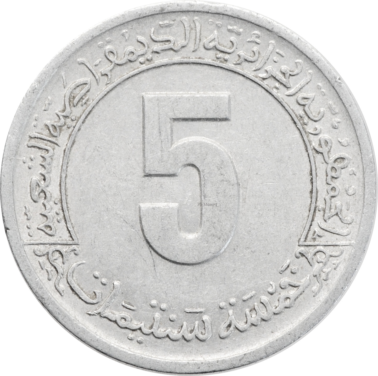 Реверс: по центру указан номинал: "5". Вдоль канта расположена надпись: "الجمهورية الجزائرية الديمقراطية الشعبية / خمسة سنتيمات".