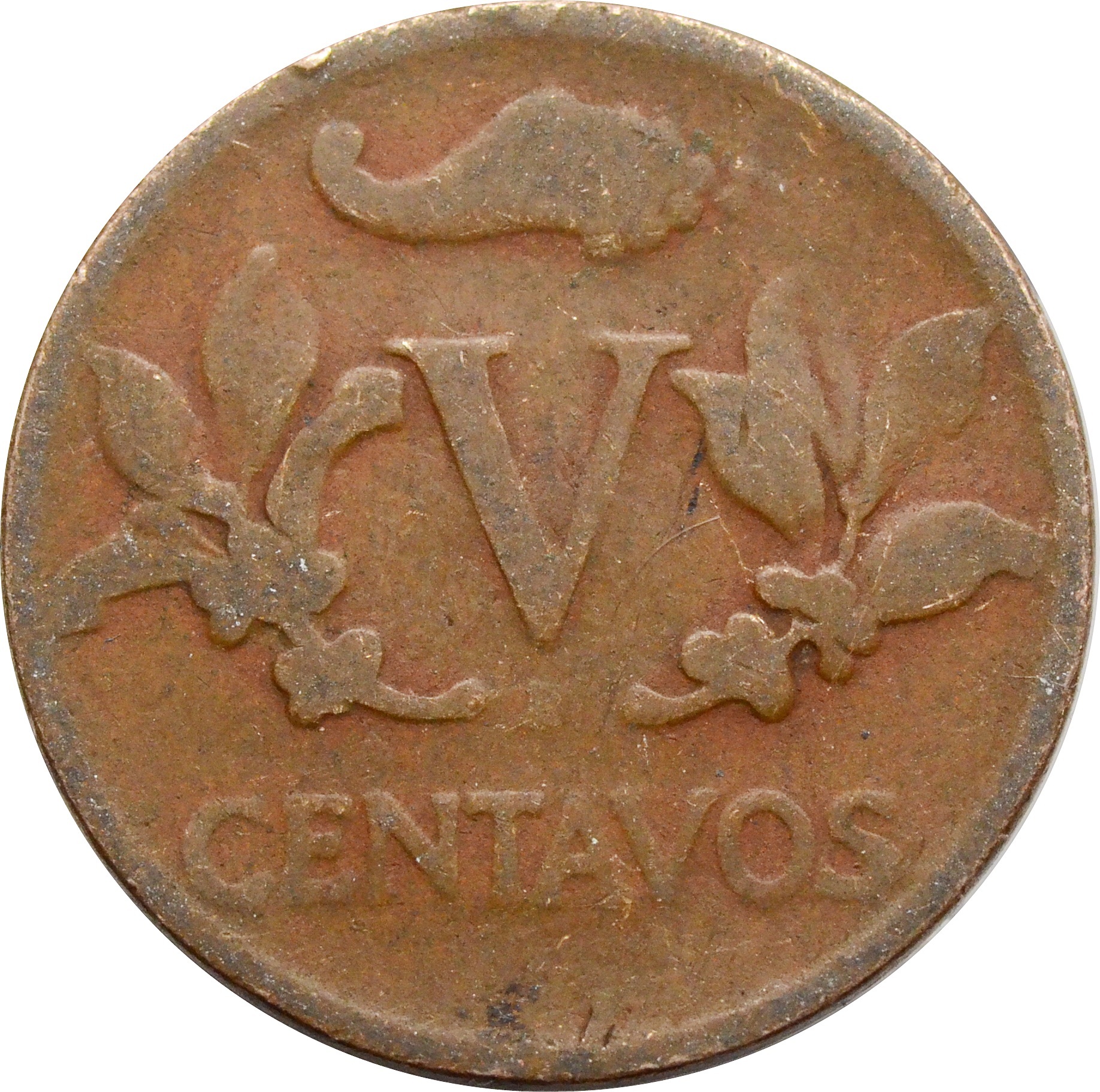 Реверс: по центру монеты указан номинал в две строки: "V CENTAVOS".