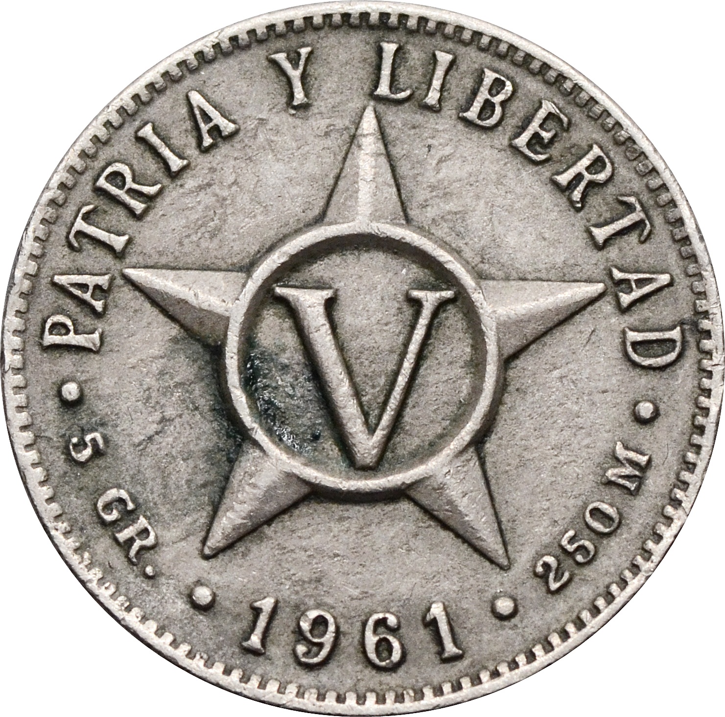 Аверс: в центре изображена звезда. В верхней части надпись: "PATRIA Y LIBERTAD" . В нижней части указан год чеканки: "1961".