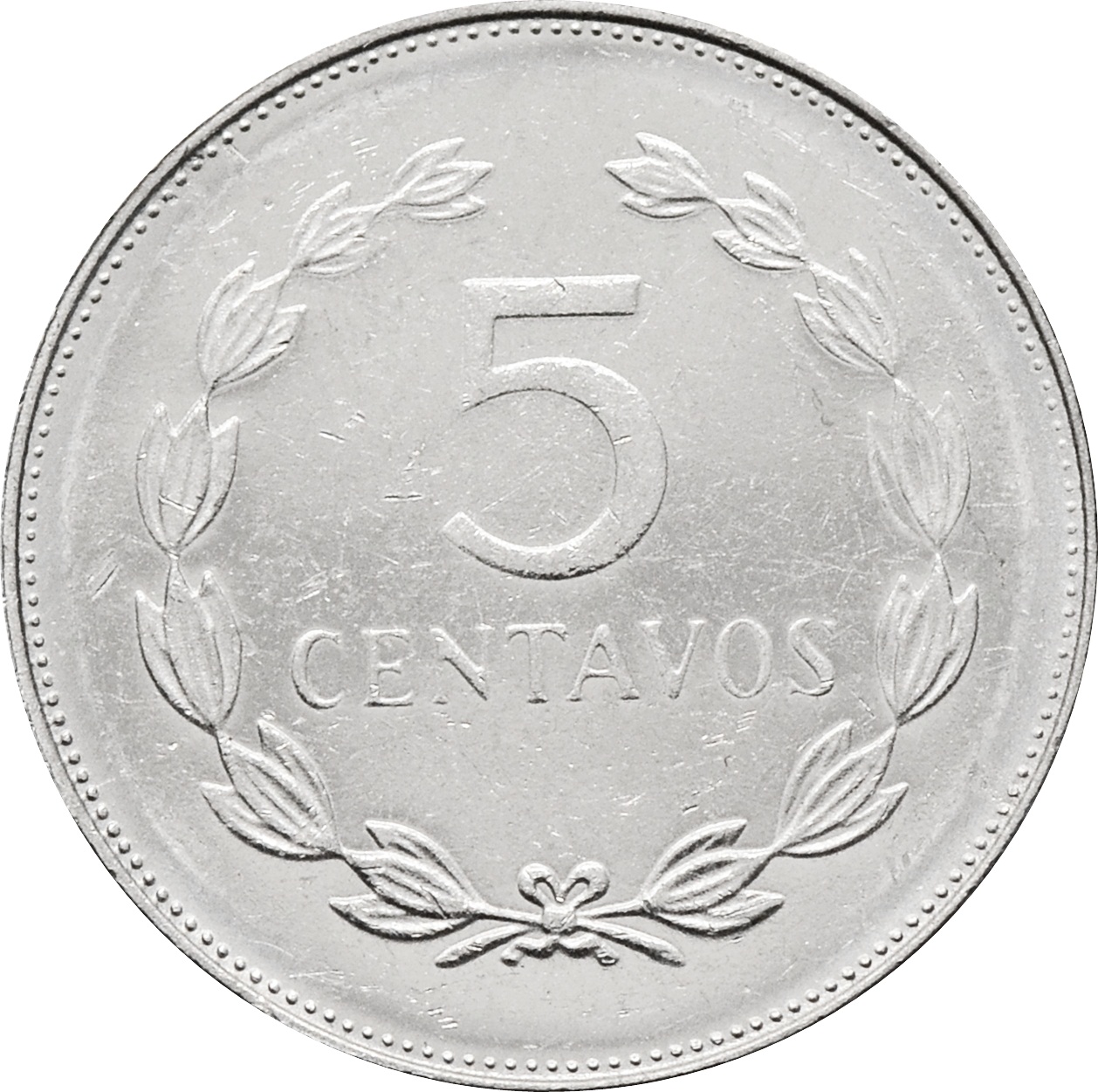 Реверс: в центре монеты указан номинал монеты в обрамлении венков: "5 CENTAVOS".