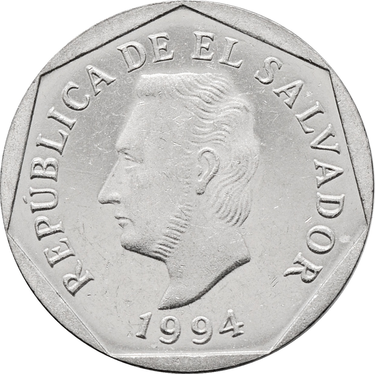 Аверс: по центру портрет Франсиско Морасан. Под ним год чеканки монеты: "1994". Вдоль канта, по кругу, надпись: "REPUBLICA DE EL SALVADOR".