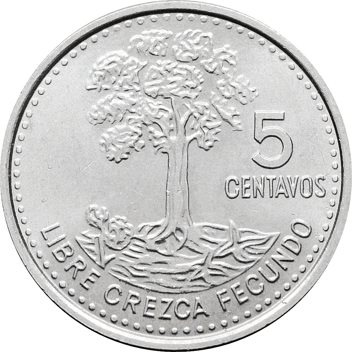 Реверс: по центру изображено дерево. Слева указан номинал в две строки: "5 CENTAVOS". В самом низу подпись: "LIBRE CREZCA FECUNDO".