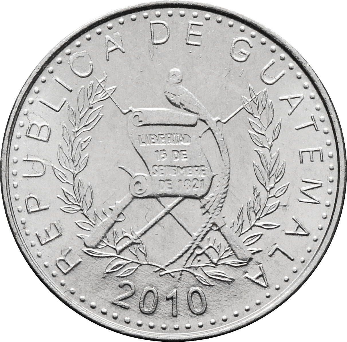 Аверс: в центре государственный герб Гватемалы, надпись по канту: "REPUBLICA DE GUATEMALA". Внизу расположен год чеканки монеты: "2010".