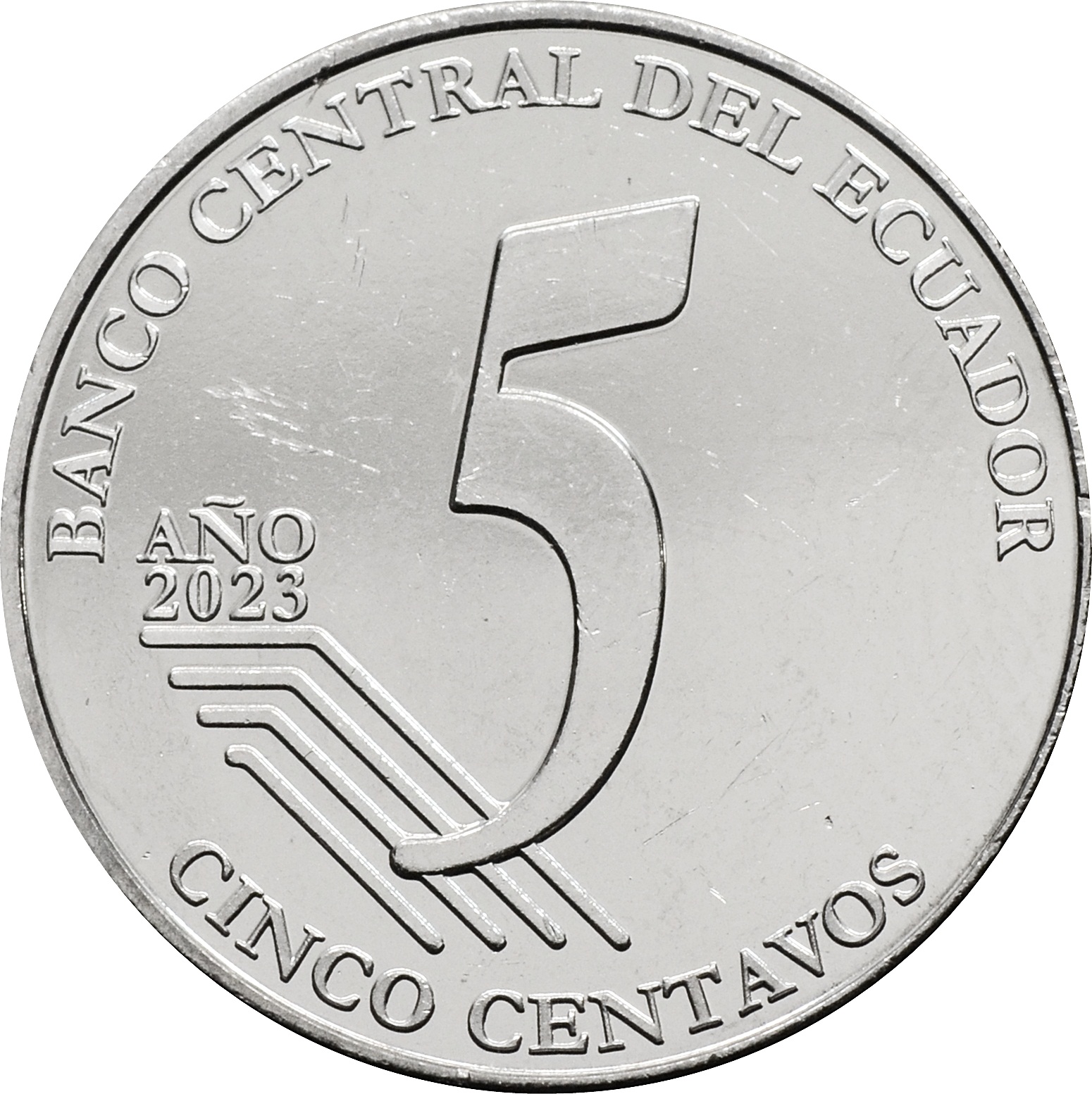Реверс: по центру монеты указан номинал большой цифрой - "5". Вдоль нижнего края монеты надпись: "CINCO CENTAVOS", слева надпись поверх стилизованного флага: "AÑO 2023". Вверху расположен текст: "BANCO CENTRAL DEL ECUADOR".