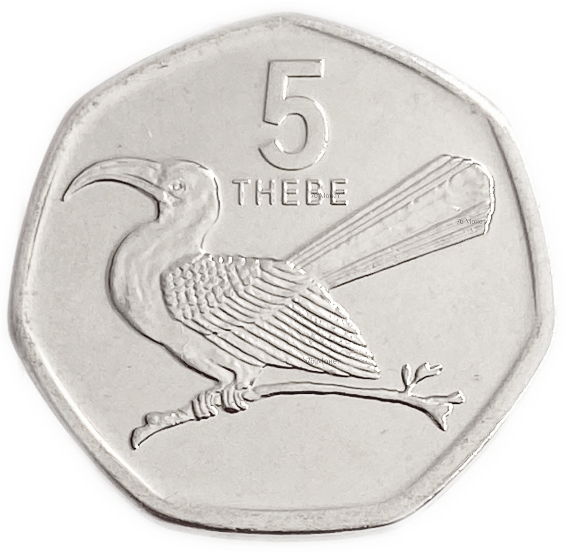 Реверс: по центру изображен токо, над которым указан номинал: "5 THEBE".