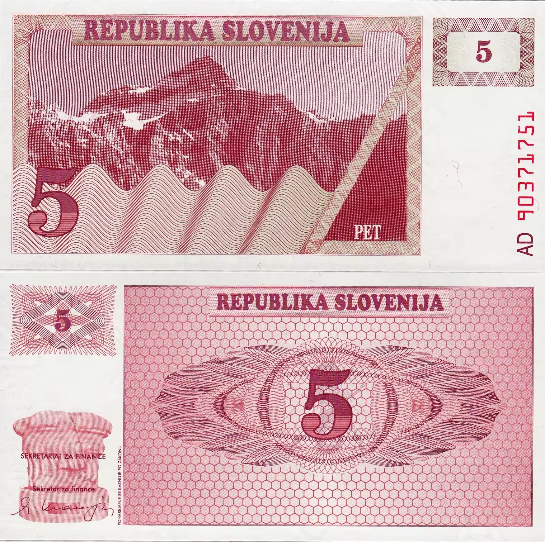 Лицевая сторона: центральную часть банкноты занимает изображение горы Триглав - высочайшая вершина Словении. Сверху надпись: "REPUBLIKA SLOVENIJA". В правом верхнем и левом нижнем углах расположен номинал цифрой -"5". С правого края указан серийный номер.