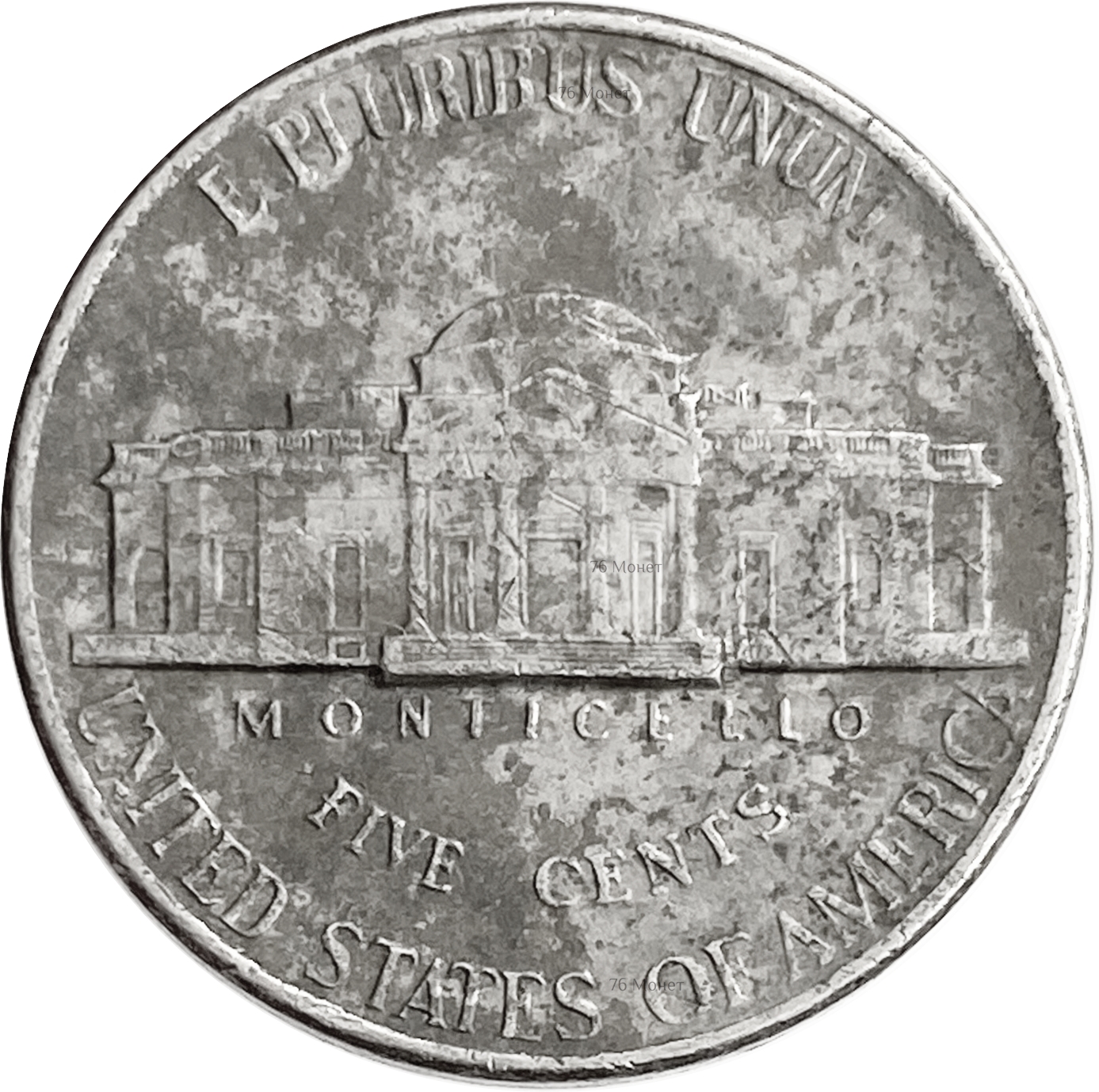 Реверс: по центру расположено изображение здания Монтичелло - усадьбы Томаса Джефферсона на юге штата Вирджиния. Под изображением здания указано его название: "MONTICELLO". Ниже номинал монеты прописью: "FIVE CENTS", а под номиналом: "UNITED STATES OF AMERICA". Над изображением здания надпись на латинском языке: "E PLURIBUS UNIUM".