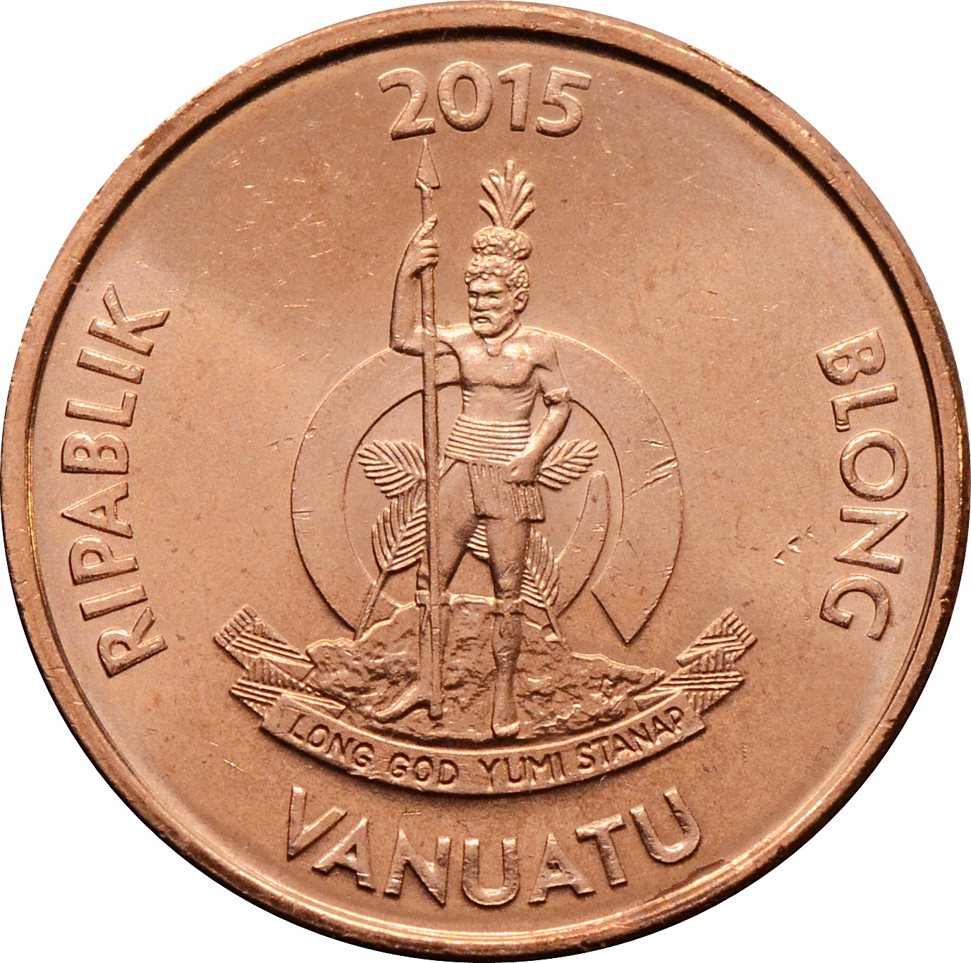 Аверс: в центре монеты расположен герб Вануату, а над гербом год чеканки: "2015". Вдоль края надпись: слева - "RIPABLIK", справа - "BLONG", а внизу - "VANUATU".