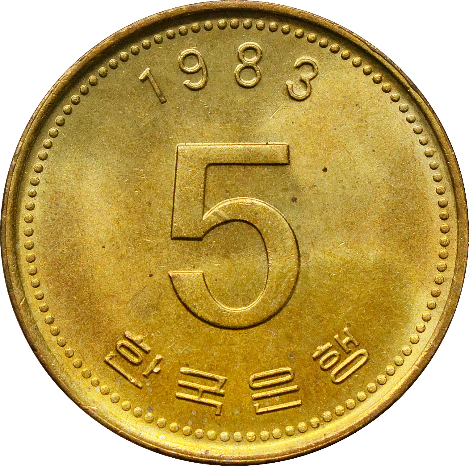 Реверс: в центре монеты указан номинал цифрой 5", ниже полукругом надпись: "한국은행" (БАНК КОРЕИ), а в верхней части год чеканки: "1983".