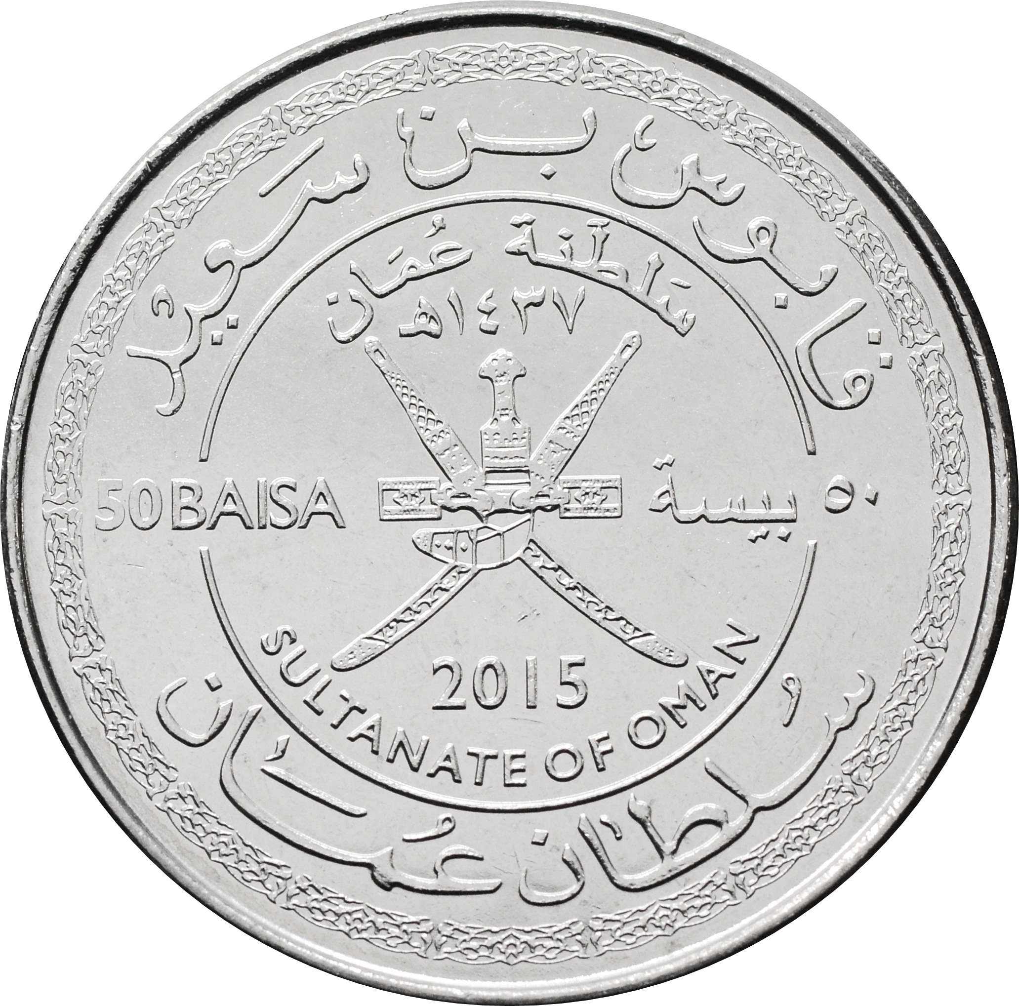 Реверс: в центре монеты изображен герб Омана состоящий из двух скрещённых сабель в ножнах (клинками вниз), и наложенным на них ханджаром в ножнах, с деталями ремней. Слева от центра указан номинал: "50 BAISA", справа он же на арабском. Снизу год чеканки: "2015"и надпись: "SULTANATE OF OMAN". Так же вдоль канта текст: "سلطان عمان / سلطنة عمان / قابوس بن سعيد".