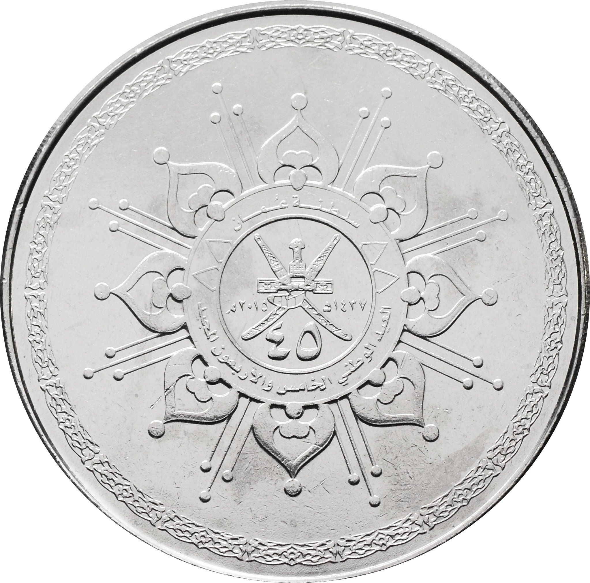 Аверс: по центру маленький герб Султаната Оман. По кругу идёт арабский стилизованный узор, изображающий солнце.