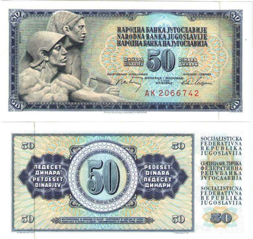 Оборотная сторона: по центру расположен номинал банкноты: "50 динаров", справа и слева надписи:"ПЕДЕСЕТ ДИНАРА PETDESET DINARJEV PEDESET DINARA". Слева надпись на трех языках: "Социалистическая федеративная республика Югославия".