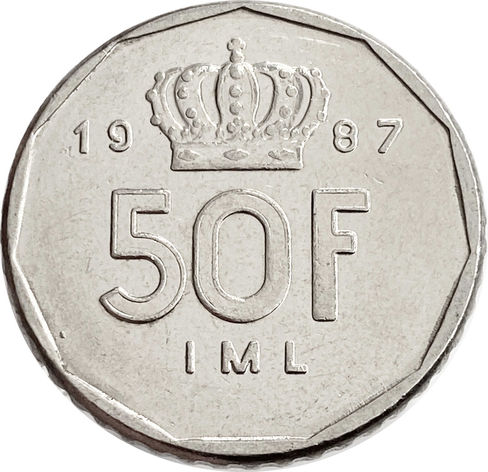 Реверс: в центре монеты указан номинал: "50F". Ниже подпись: "IML". Над номиналом королевская корона, которая разделяет год чеканки на две части: "1987".