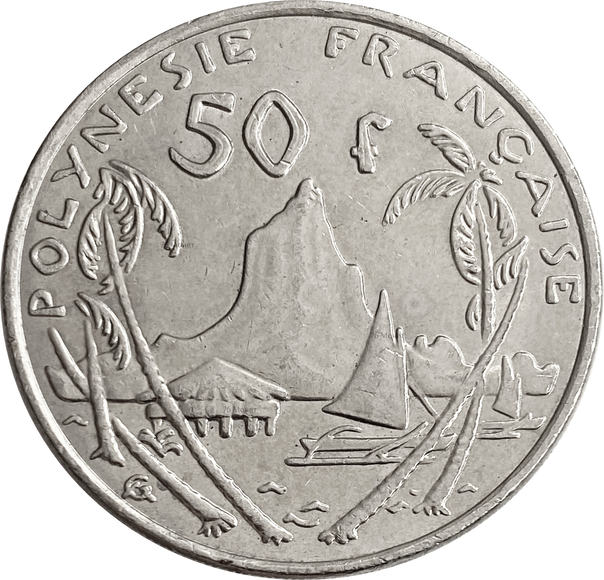 Реверс: по центру изображен прибрежный пейзаж с четырьмя пальмами и двумя каноэ-катамаранами. Сверху полукругом надпись: "POLYNESIE FRANÇAISE", под ней указан номинал монеты: "50 F".