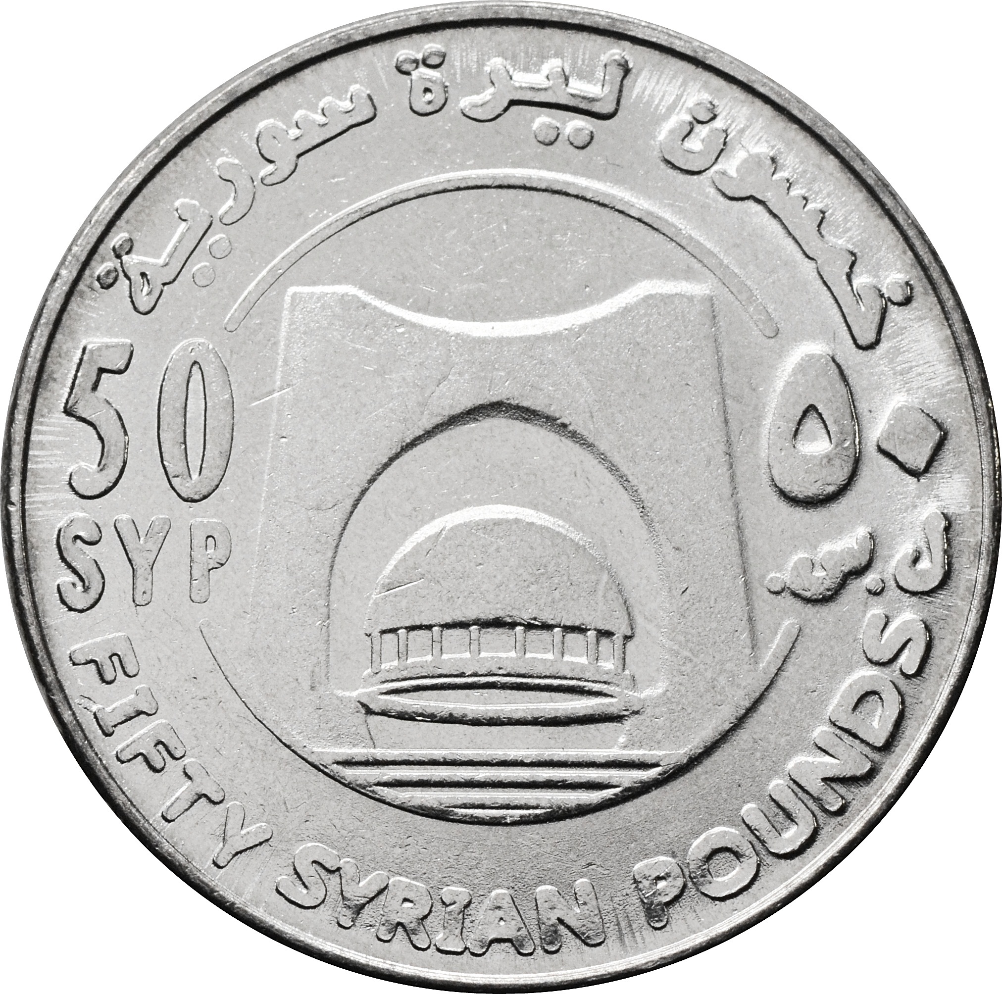 Реверс: в центре монеты изображена постройка. Вдоль канта надпись: "50 SYP FIFTY SYRIAN POUNDS ٥٠ ل.س. خمسون ليرة سورية".