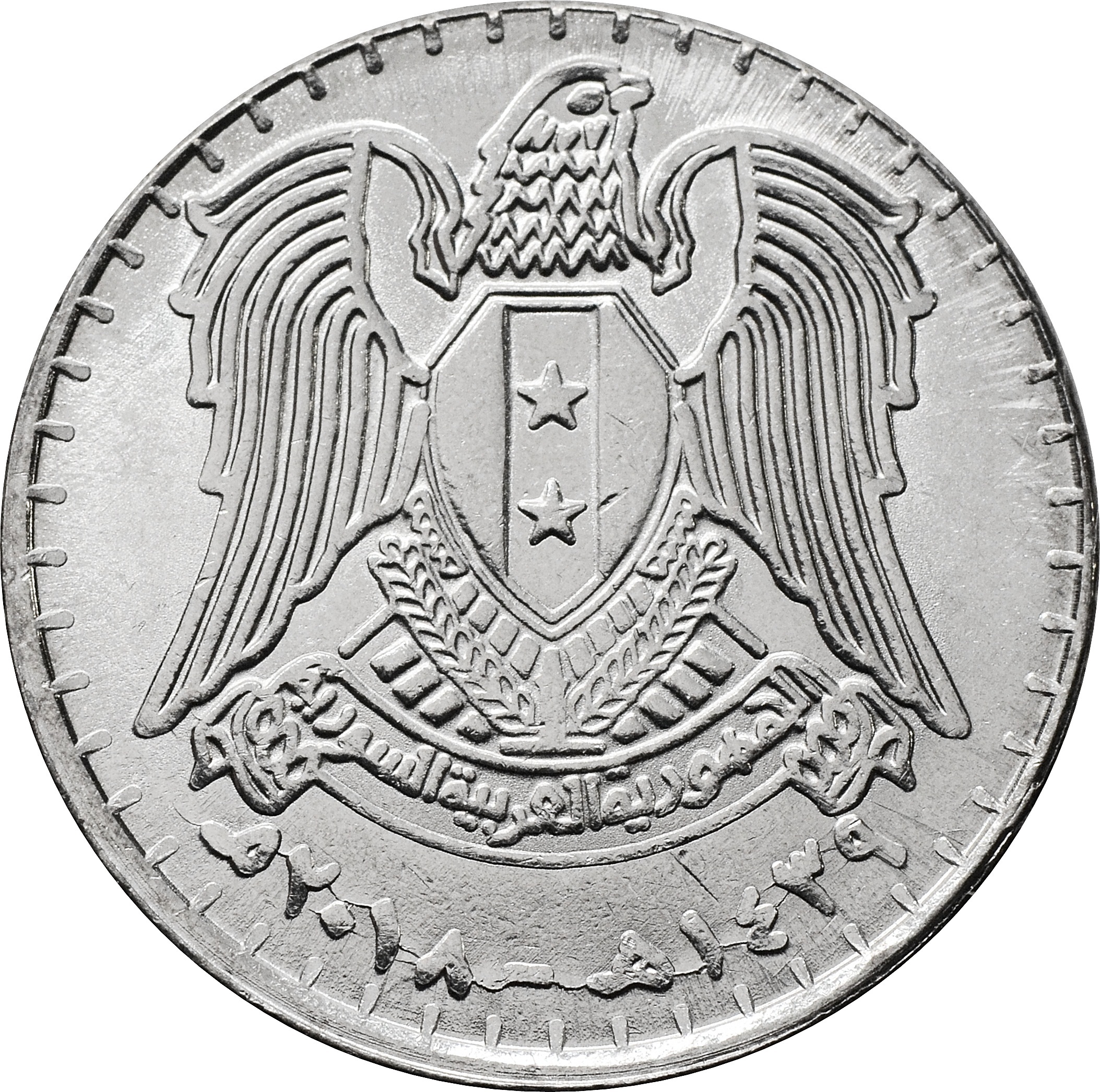 Аверс: по центру изображен герб Сирии. Ниже указан год чеканки: "٢٠١٨".