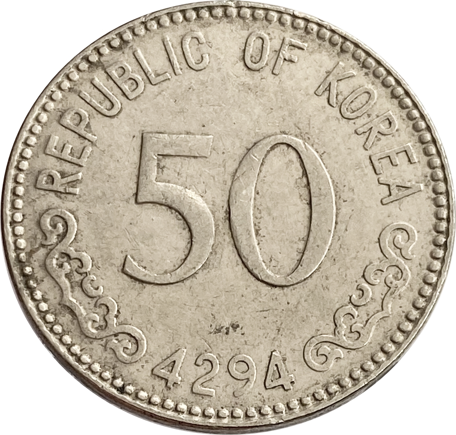 Реверс: в центре монеты номинал цифрой - "50", ниже год чеканки: "4294". Сверху подпись: "REPUBLIC OF KOREA".