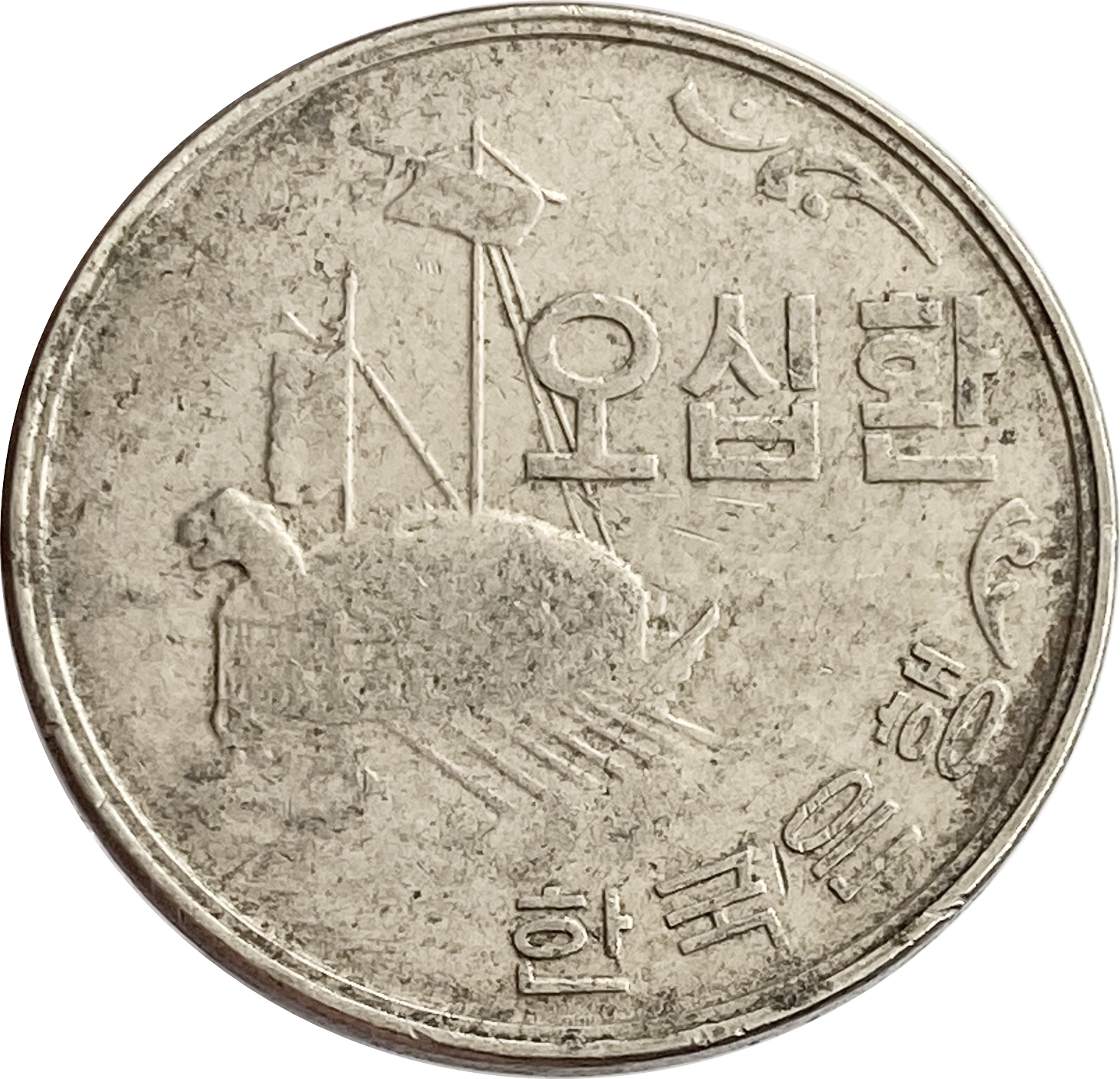 Аверс: в верхней части монеты изображена лодка. Рядом надпись на корейском: "오십환 / 한국은행".