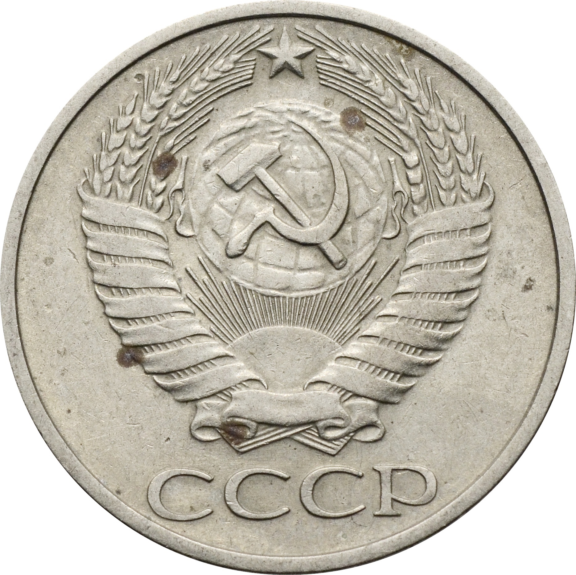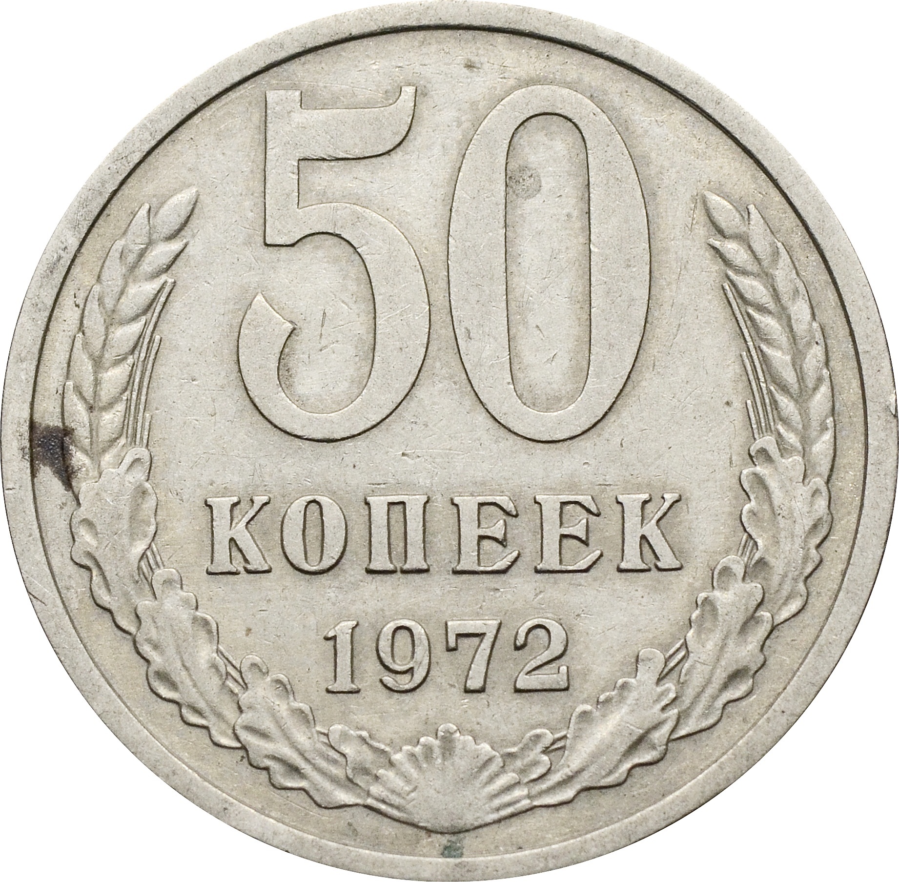 Реверс: по центру монеты указан номинал в две строки: "50 копеек". Сразу под номиналом размещен год чеканки: "1972". В нижней части монеты, полукругом, изображён венок, состоящий из колосьев пшеницы и дубовых листьев сплетенных между собой. Место сплетения украшено декоративной ракушкой.