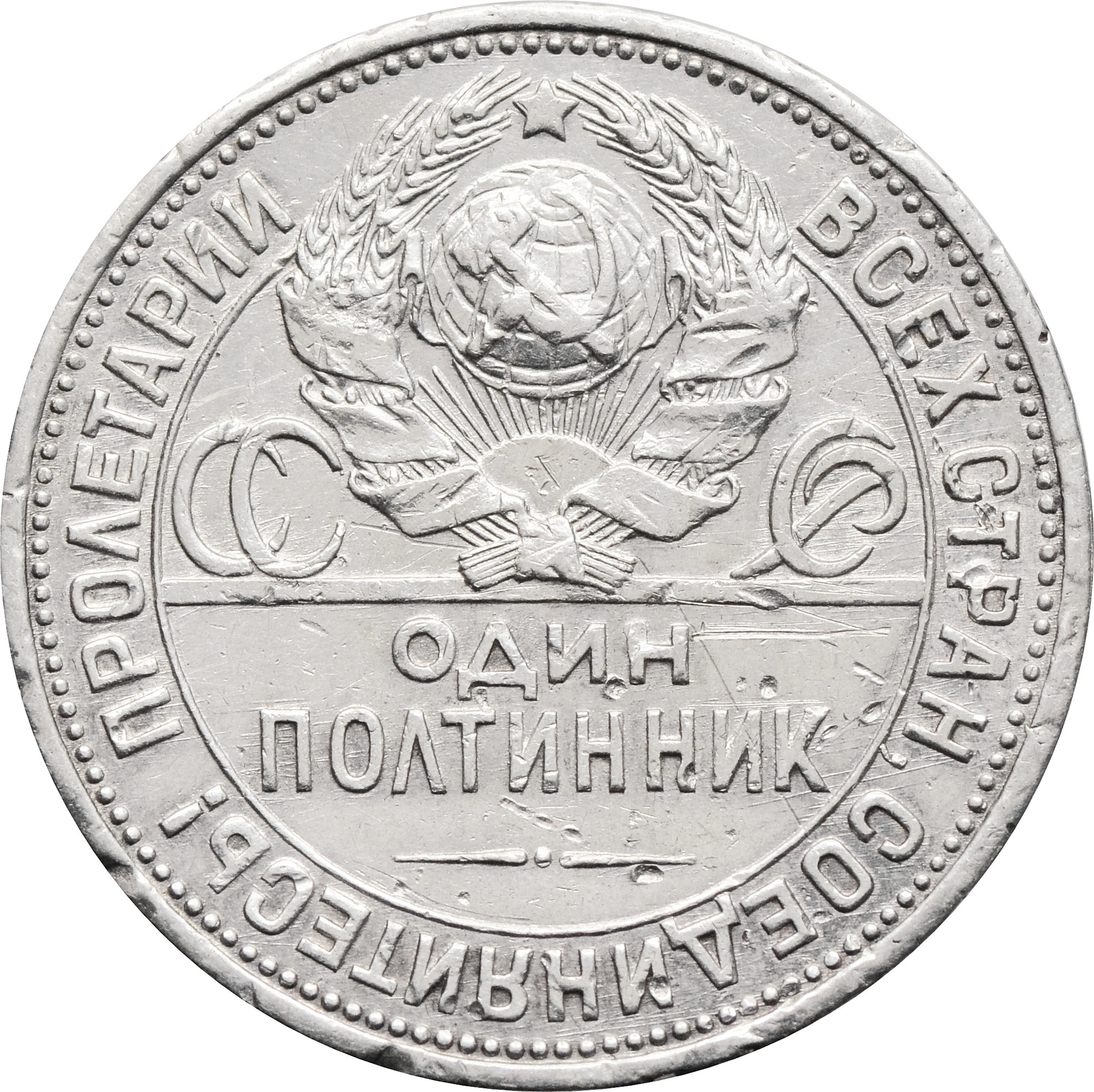 Аверс: чуть выше центра монеты изображен герб СССР с 7-ю витками ленты. Под гербом указан номинал прописью: "ОДИН ПОЛТИННИК". Вдоль канта, по кругу, расположена надпись: "ПРОЛЕТАРИИ ВСЕХ СТРАН, СОЕДИНЯЙТЕСЬ!".