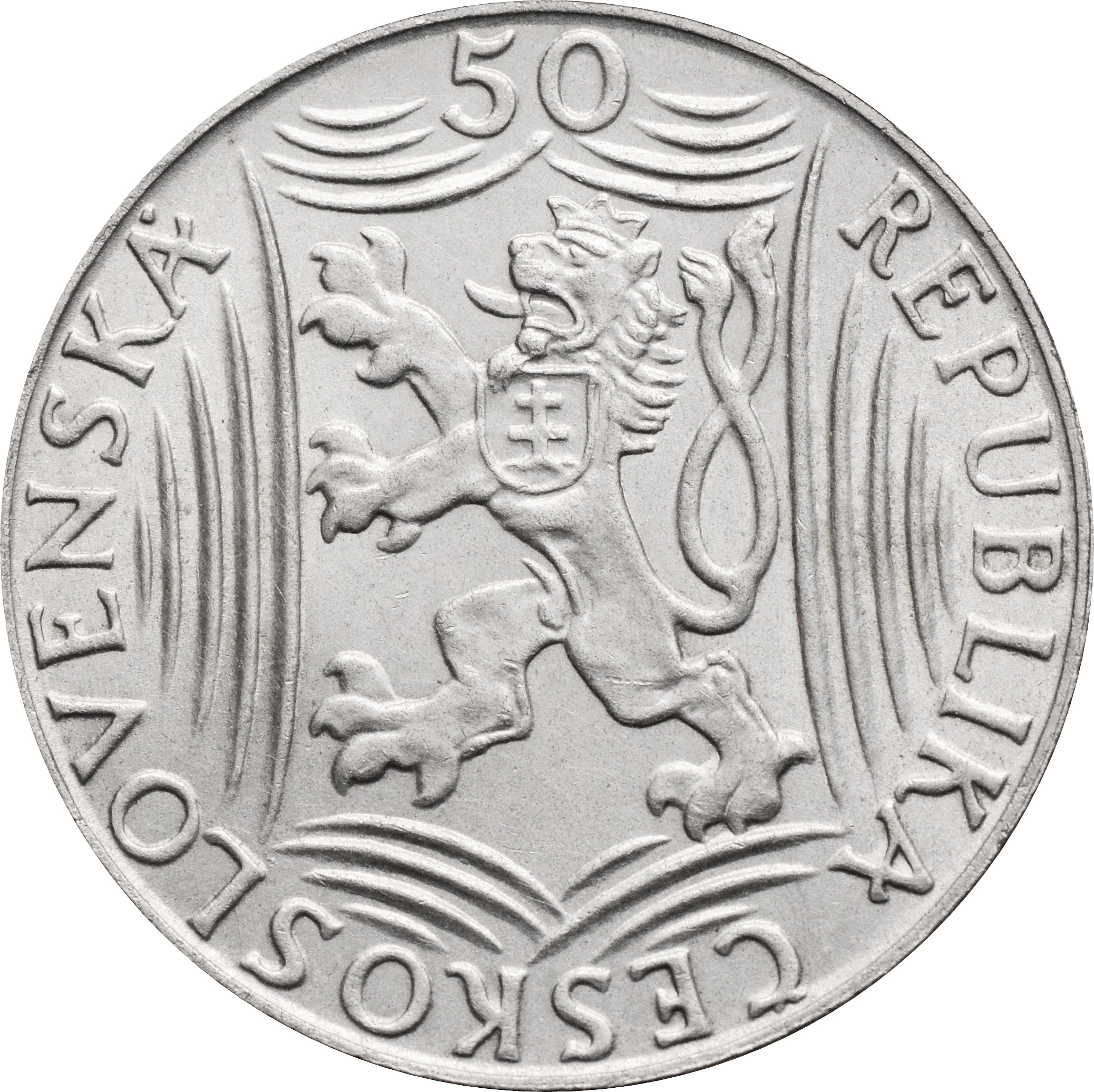 Аверс: в центре монеты расположен герб Социалистической республики Чехословакии. Под ним надпись: "REPUBLIKA ČESKOSLOVENSKÁ". Над гербом указан номинал - цифра "50".