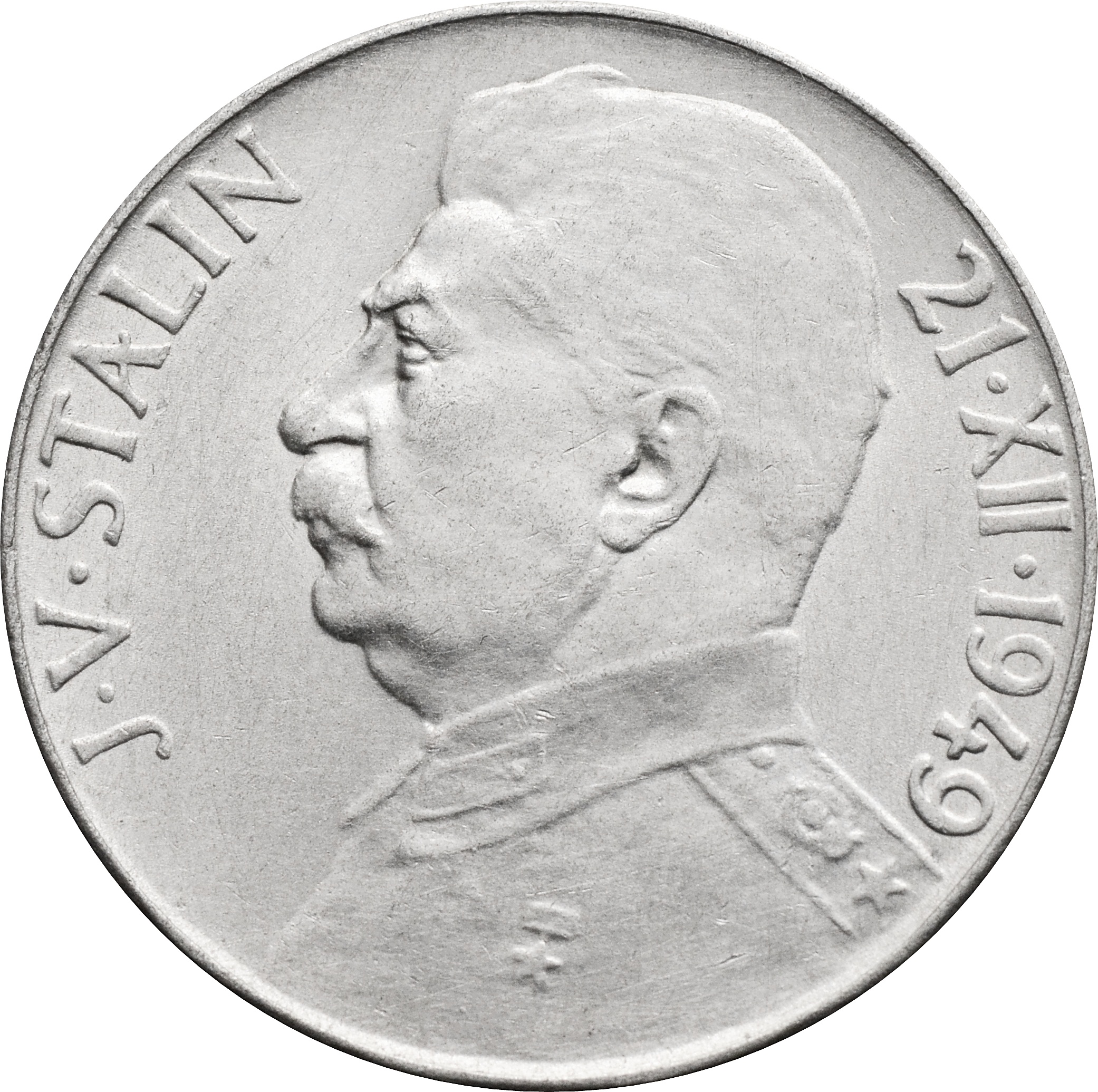 Реверс: по центру размещен портрет Сталина. Справа от него дата: "21 XII 1949", а левее подпись: "J V STALIN".