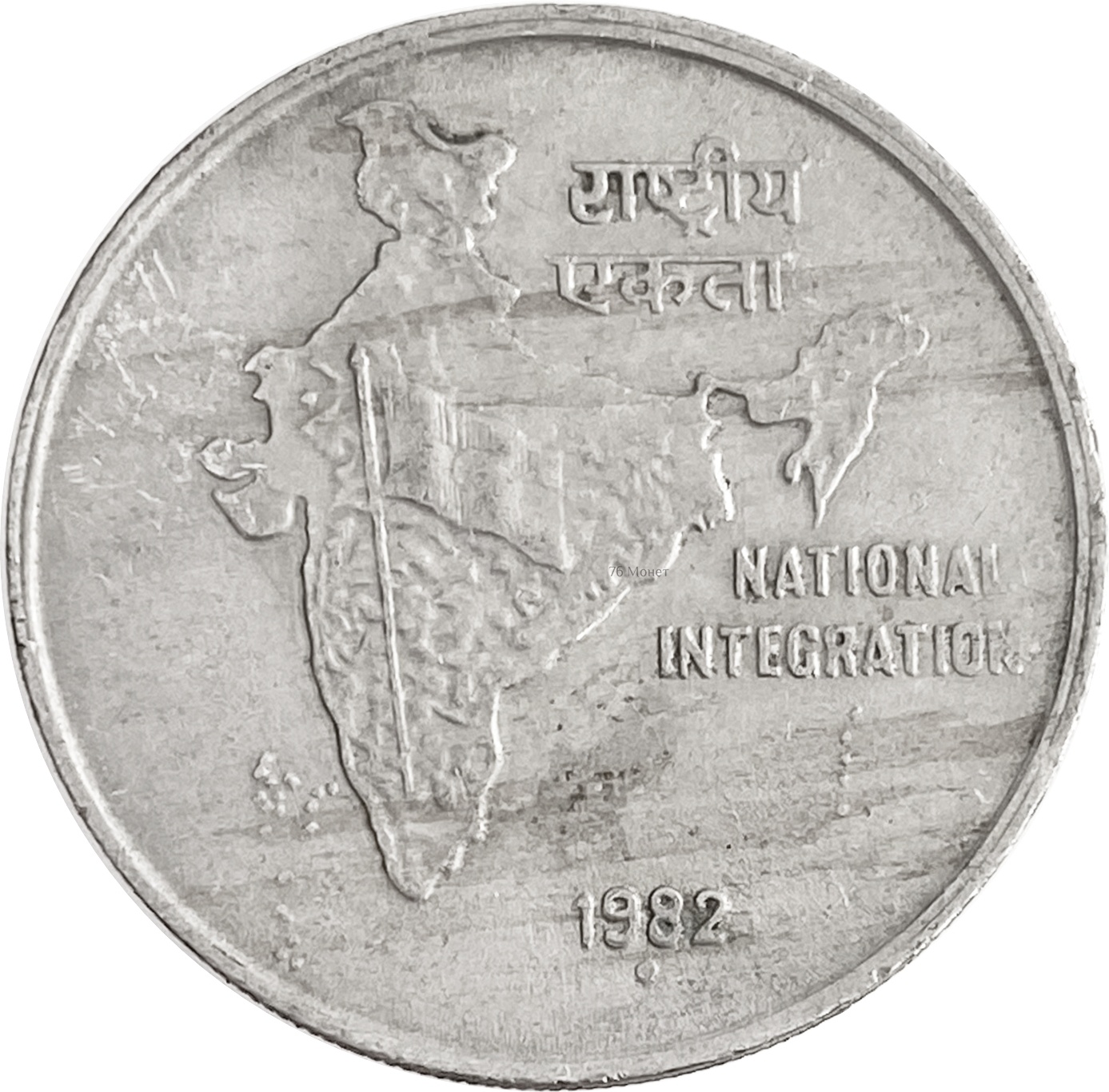 Аверс: в центре расположена карта. Справа от нее надпись на английском: "NATIONAL INTEGRATION" и хинди - "राष्ट्रीय एकता". Ниже указан год чеканки монеты.