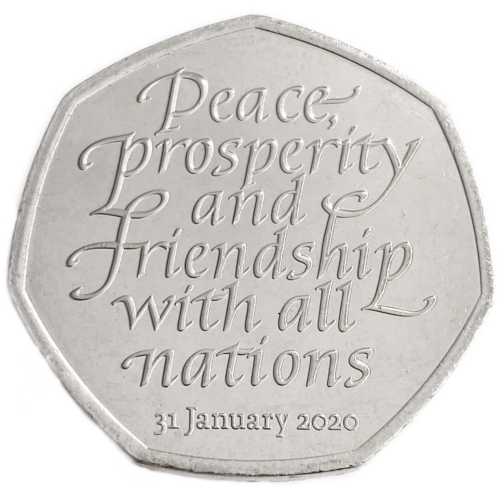 Реверс: по центру надпись: "Peace prosperity and friendship of all nations 31 January 2020".