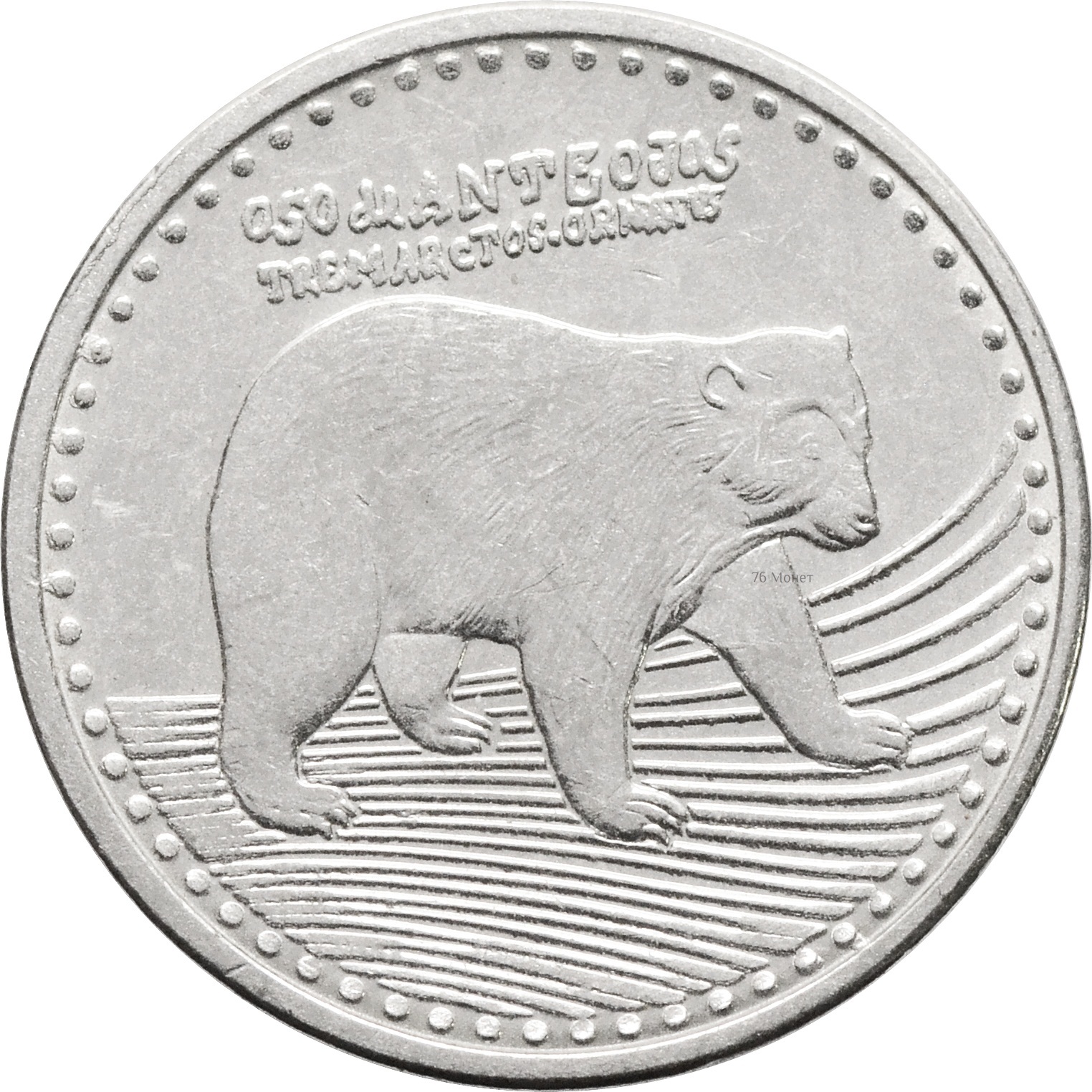 Аверс: в центре монеты изображен медведь. Над ним надпись: "OSO de ANTEOJOS / TREMARCTOS ORNATUS".