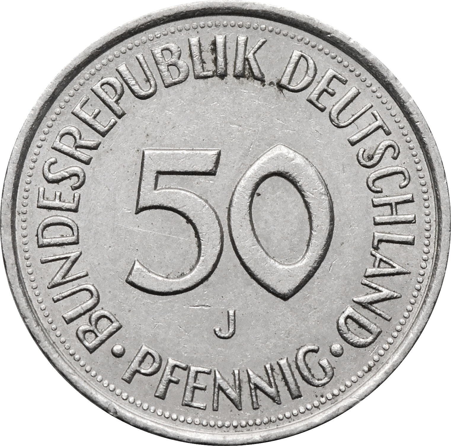 Реверс: по центру указан номинал монеты в две строки: "50 PFENNIG". Вдоль канта надпись: "BUNDESREPUBLIK DEUTSCHLAND".