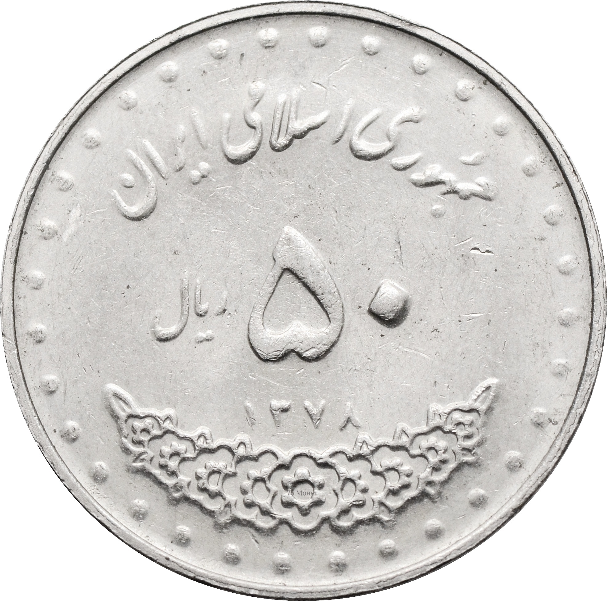 Реверс: в центре монеты указан номинал арабскими цифрами: "۵۰", снизу год чеканки по Хиджре. Над номиналом размещена надпись на персидском языке: "جمهوری اسلامی ايران" (ИСЛАМСКАЯ РЕСПУБЛИКА ИРАН). Слева и справа от номинала стилистический лавровый венок.