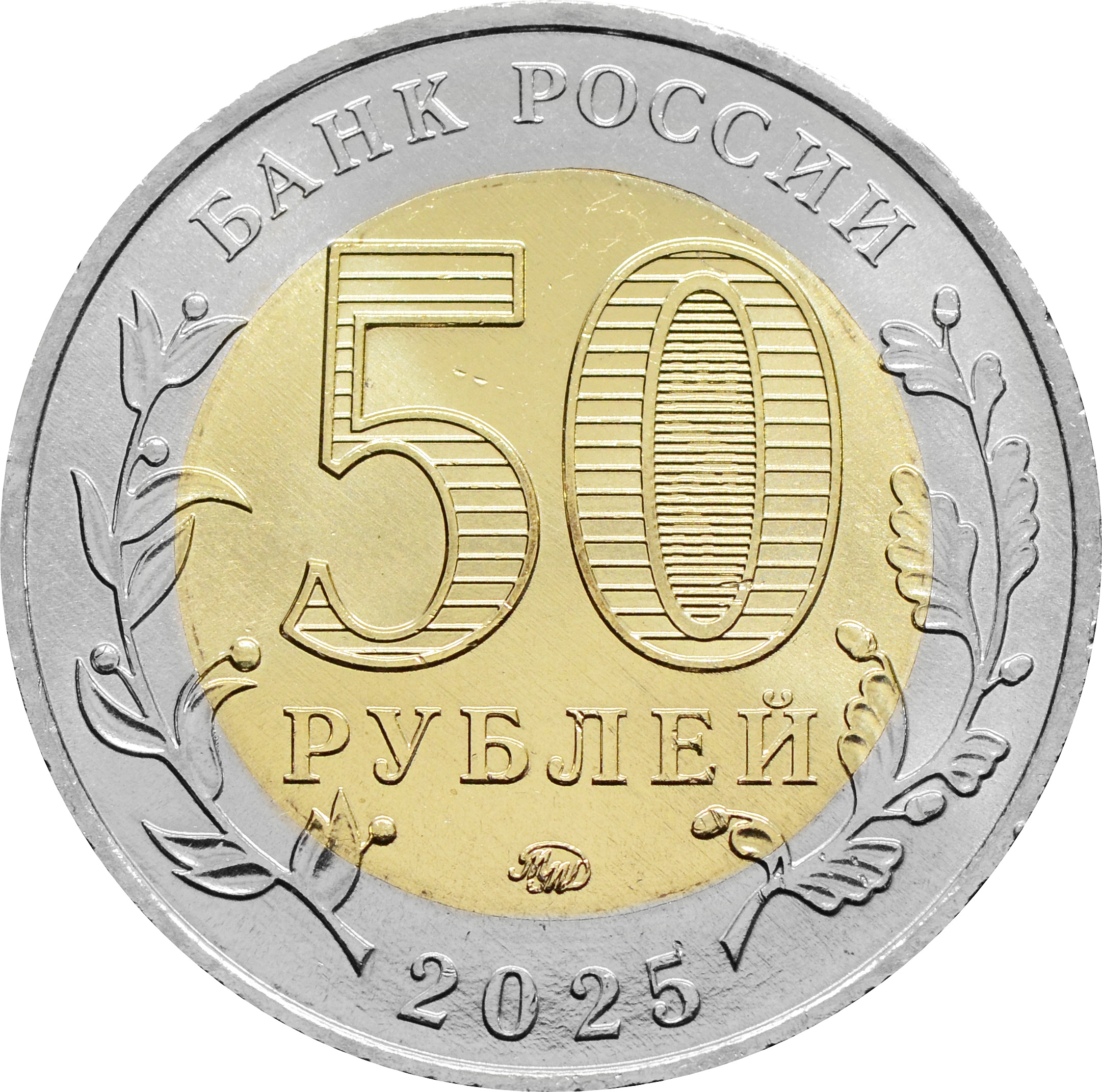 Аверс: в центре указан номинал монеты: "50 РУБЛЕЙ". Внутри цифры "0" - скрытые, видимые поочередно при изменении угла зрения изображения цифры: "50" и надписи: "РУБЛЕЙ". В нижней части знак монетного двора: "ММД". В верхней части кольца по окружности расположена надпись: "БАНК РОССИИ", в нижней указан год чеканки: "2025". Слева и справа изображены стилизованные ветви растений.