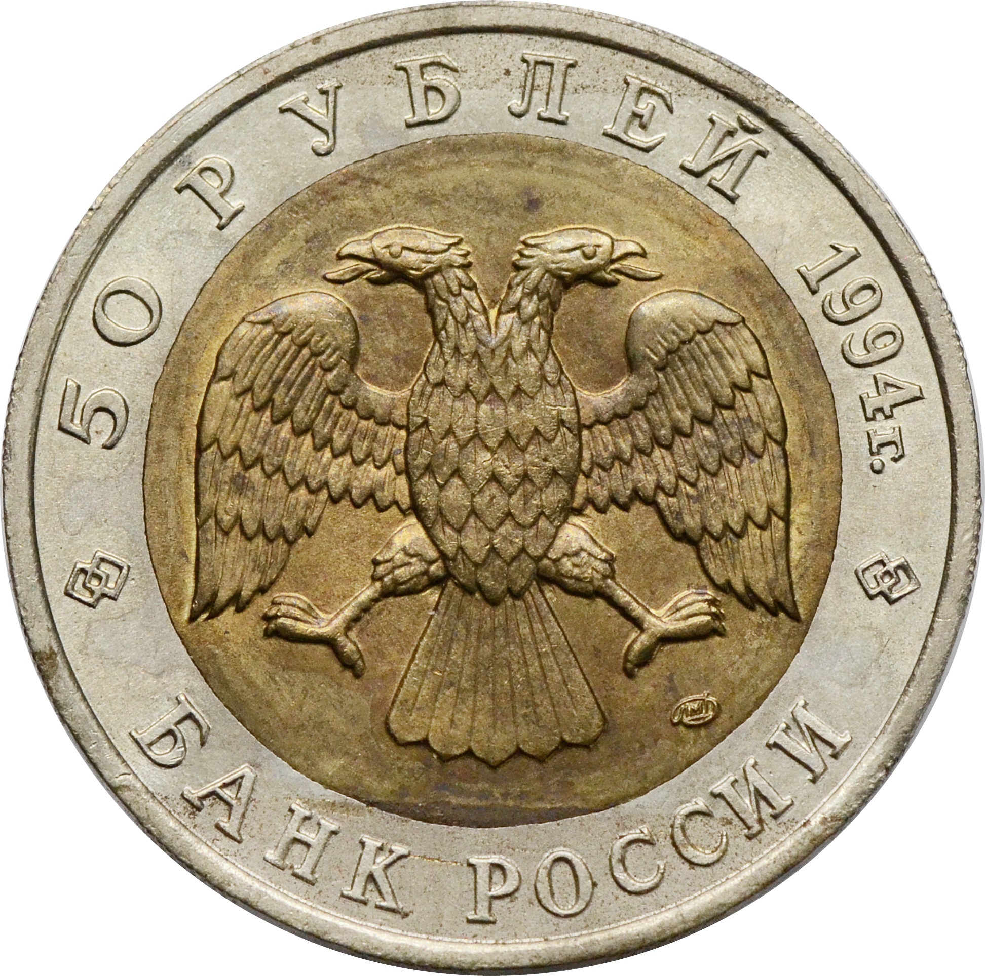 Аверс: сверху, вдоль края монеты, расположена надпись: "50 РУБЛЕЙ 1994г.". По центру изображен двуглавый орел. Под орлом расположен символ монетного двора: "ЛМД". Снизу надпись: "БАНК РОССИИ".