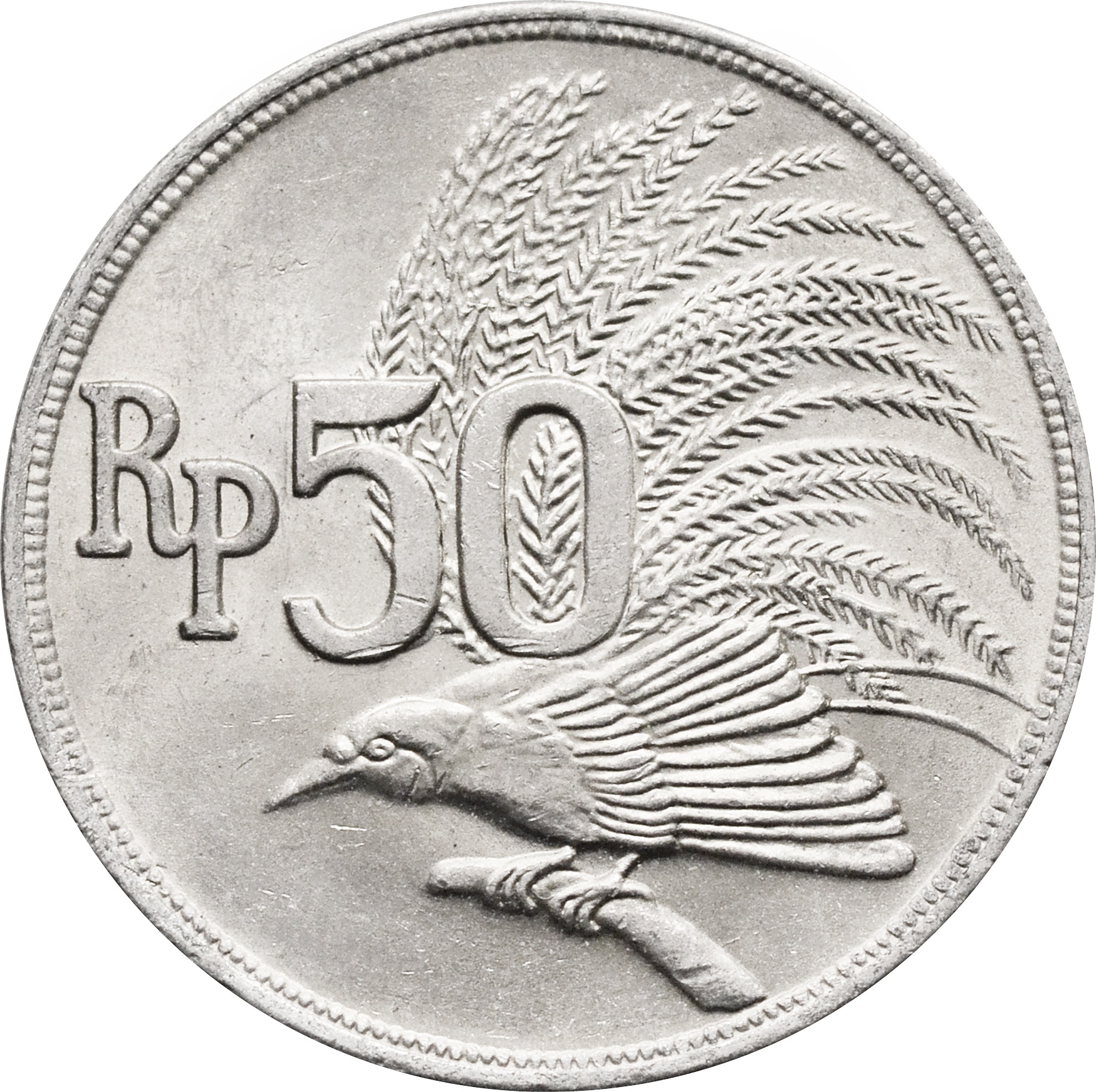 Реверс: по центру находится крупная цифра "50", ниже подпись: "RUPIAH". В самом низу расположен год чеканки: "1971", а сверху указание чеканящего банка: "BANK INDONESIA".