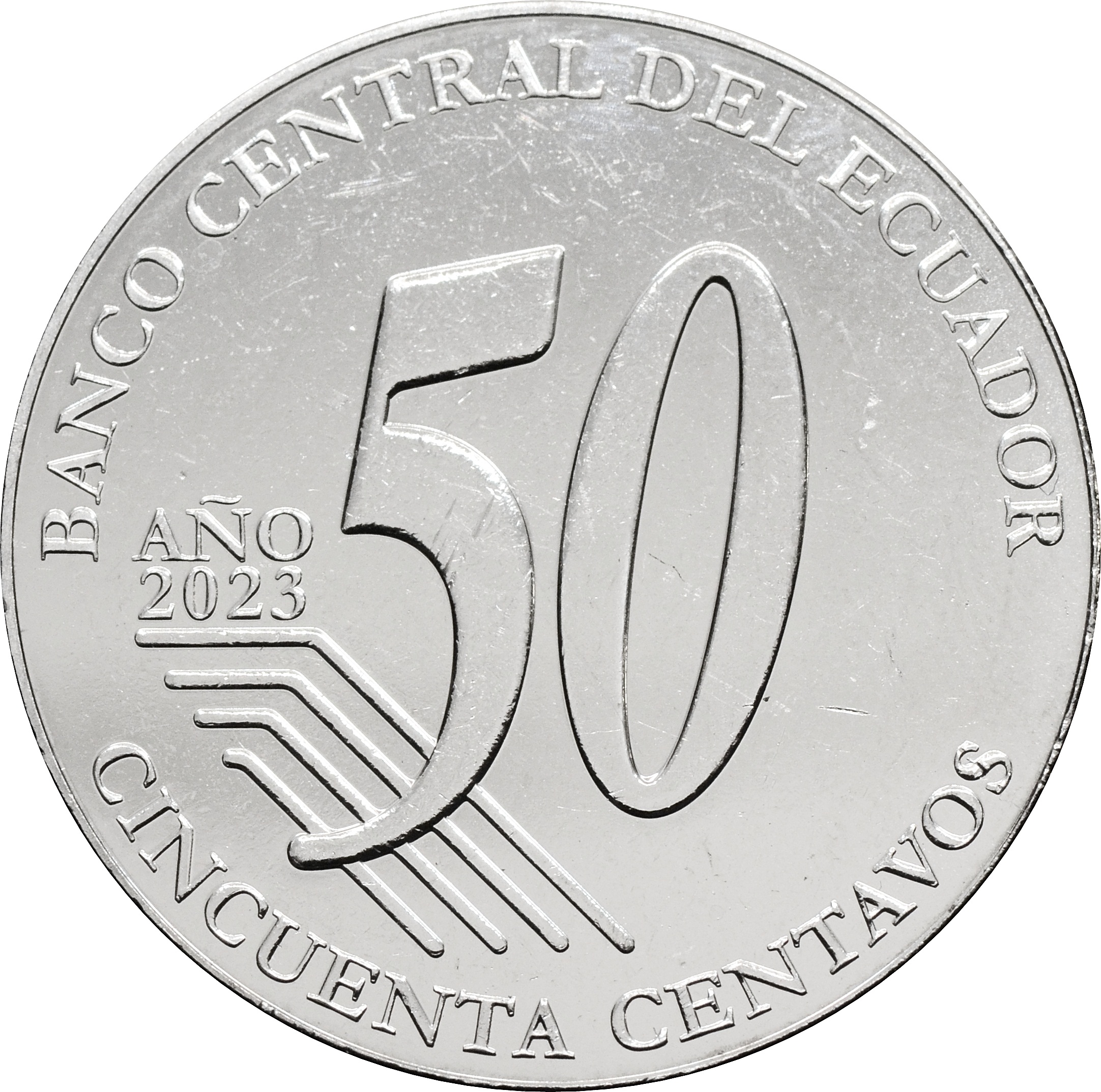 Реверс: по центру монеты указан номинал большой цифрой - "50". Вдоль нижнего края монеты надпись: "CINCUENTA CENTAVOS", слева надпись поверх стилизованного флага: "AÑO 2023". Вверху расположен текст: "BANCO CENTRAL DEL ECUADOR".