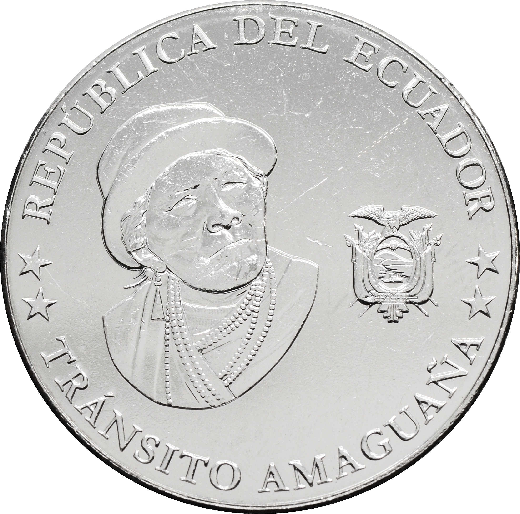 Аверс: в центре монеты портрет Транситы Амагуанья. Вдоль края монеты надписи: внизу - "**TRÁNSITO AMAGUAÑA**", а вверху - "RUPUBLICA DEL ECUADOR".