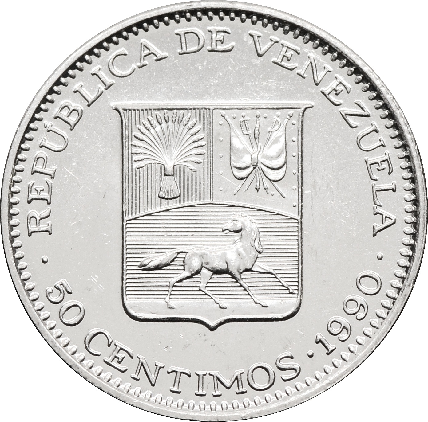 Реверс: в центре монеты расположен герб страны, ниже номинал строчки: "50 CENTIMOS". Сверху полукругом, надпись: "REPÚBLICA DE VENEZUELA". Снизу указан год чеканки монеты: "1990".
