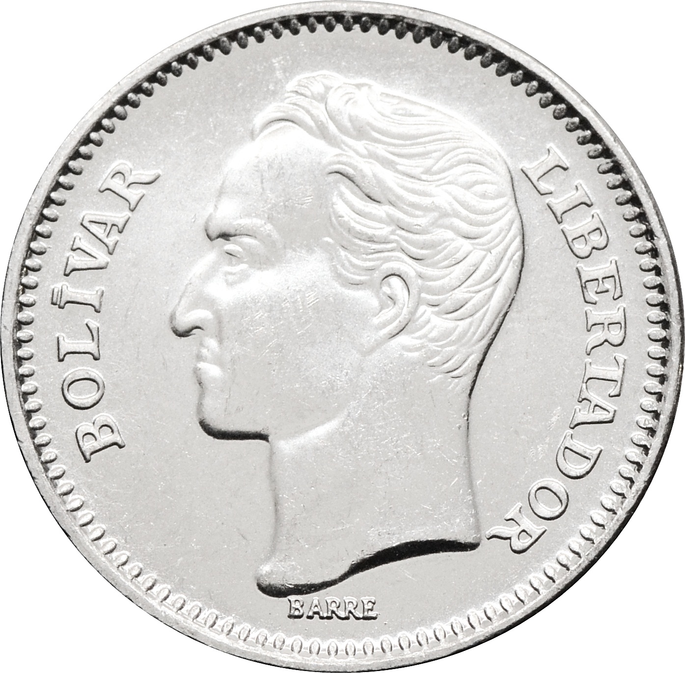 Аверс: по центру монеты расположен портрет Симона Боливара. По краям, полукругом, надпись: "BOLÍVAR LIBERTADOR".