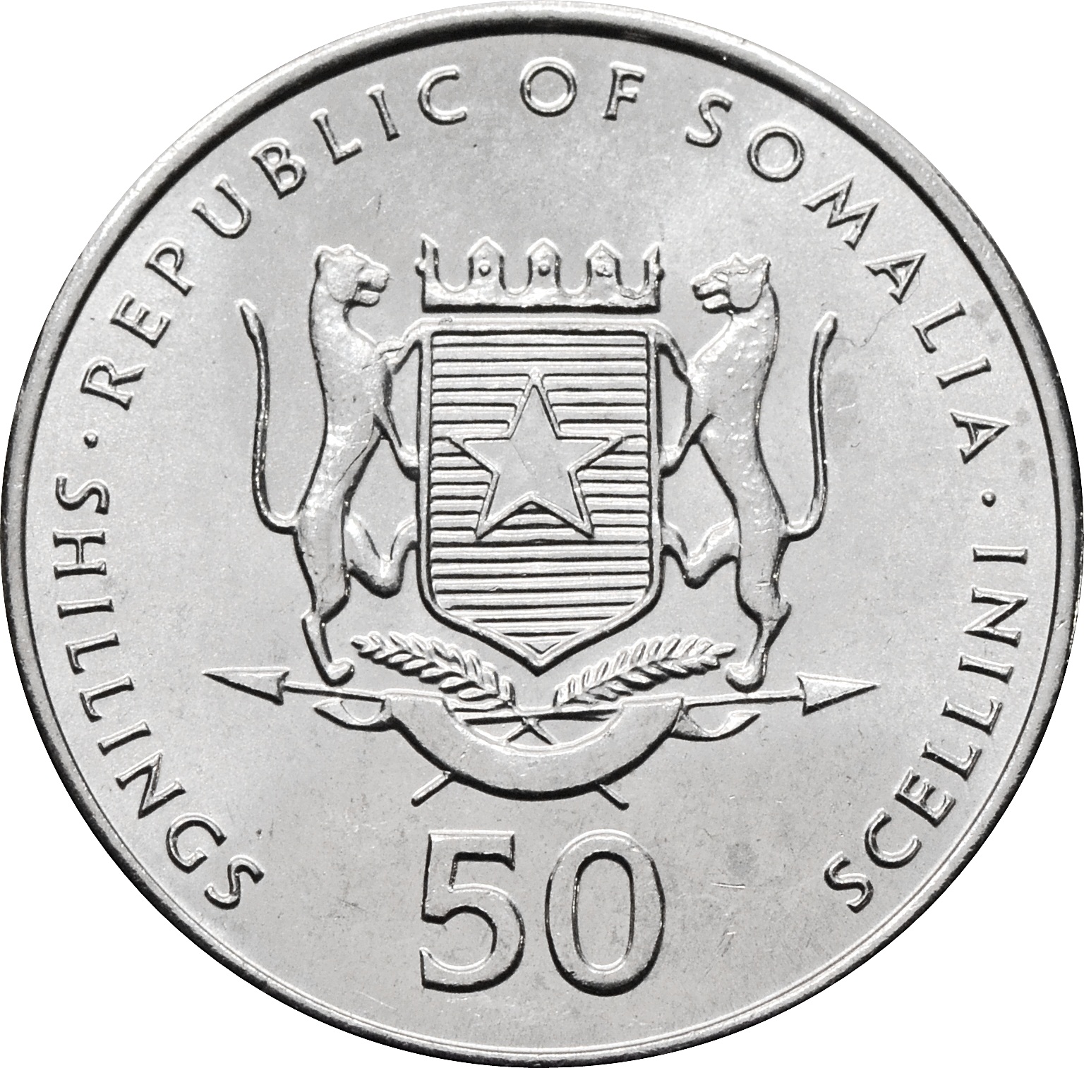 Аверс в центре расположен герб страны. По краю монеты надписи полукругом: "SHILLINGS REPUBLIC OF SOMALIA SCELLINI". Внизу указана цифра номинала - "50".