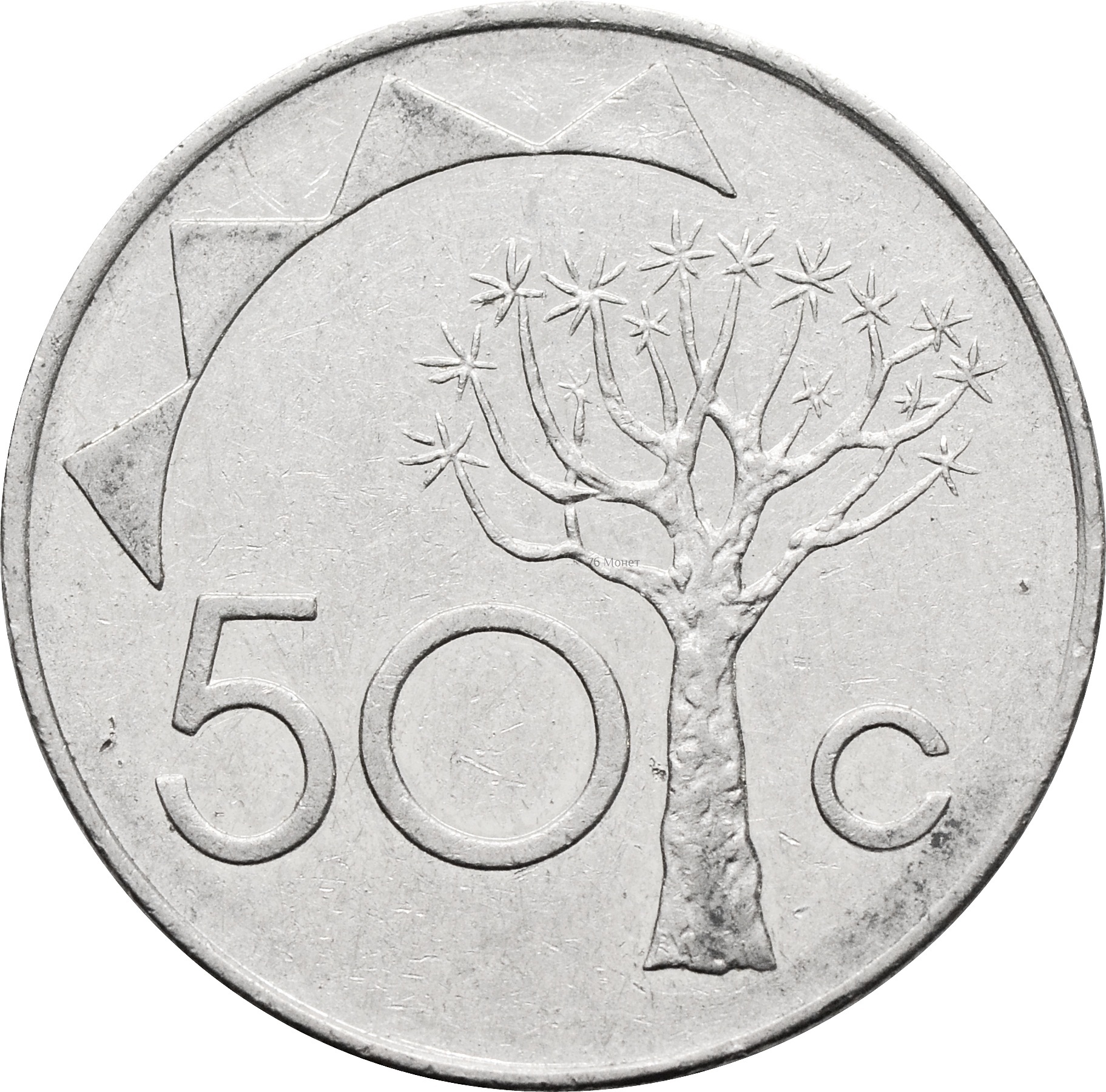 Реверс: в центре изображено дерево, разделяющее номинал на две части: "50 C".