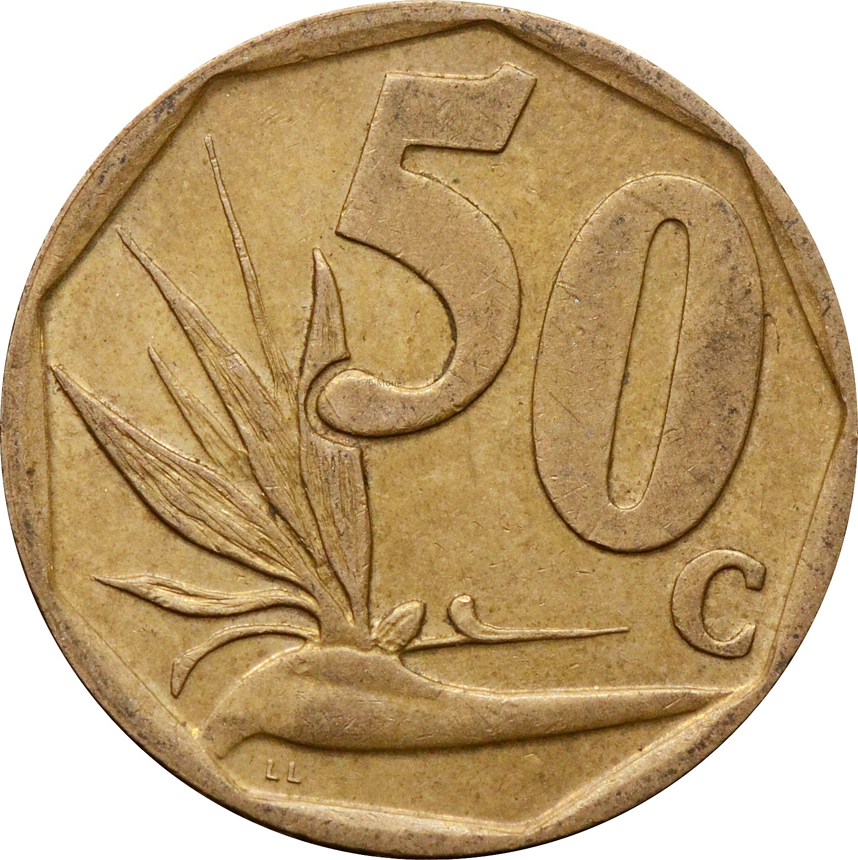 Реверс: правее от центра монеты указан номинал: "50С" и изображение стрелитции слева.