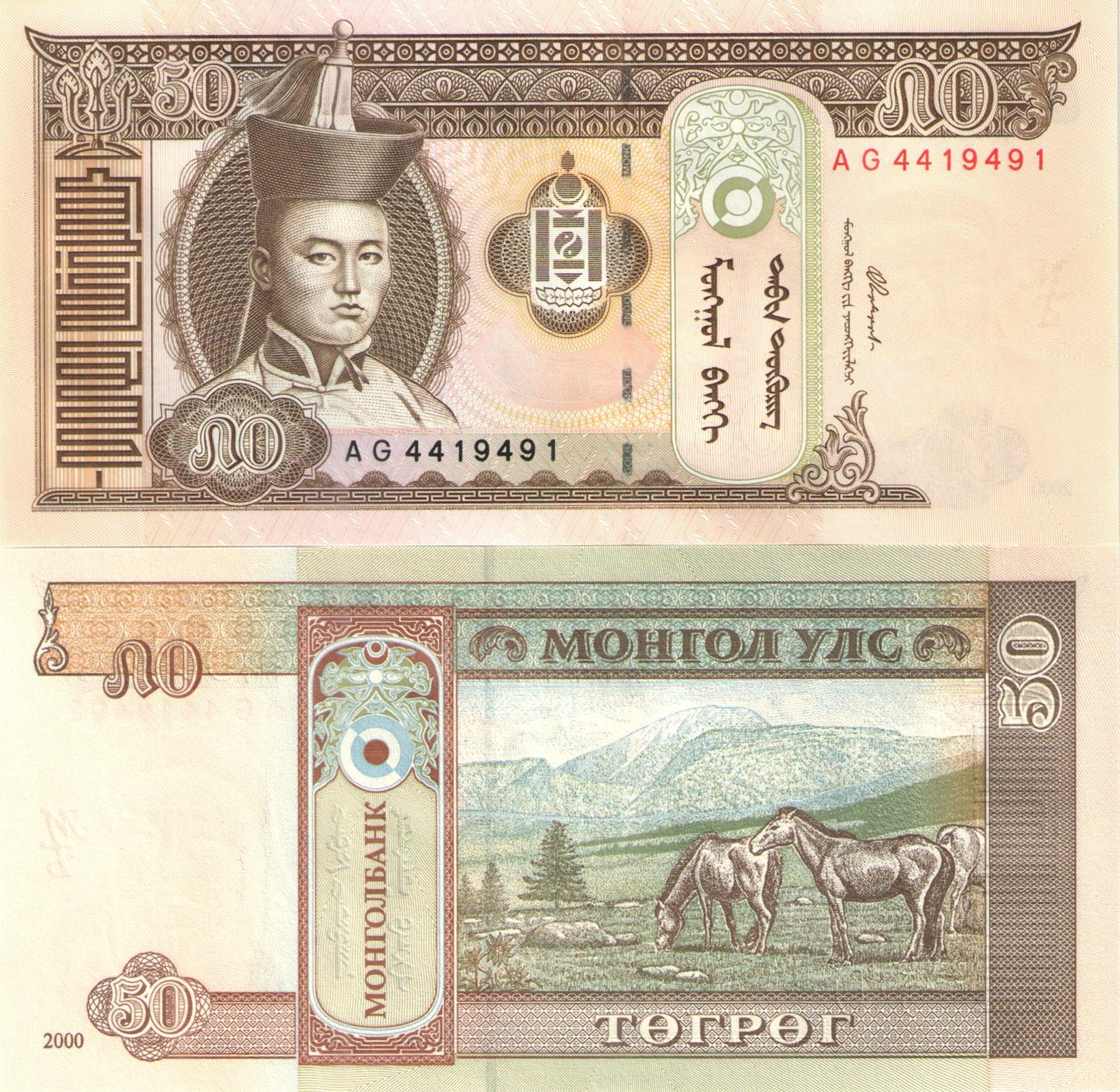 Оборотная сторона: в левой части банкноты расположено купонное поле с обозначением номинала - сверху – национальное написание, а внизу – цифрой "50", рядом год образца банкноты: "2000". В центре, в прямоугольной рамке, изображены лошади, пасущиеся на фоне горного пейзажа. В верхней части банкноты надпись: "МОНГОЛ УЛС", а в нижней: "ТӨГРӨГ". Слева, в вертикальной рамке указание выпускающего банка: "МОНГОЛБАНК".