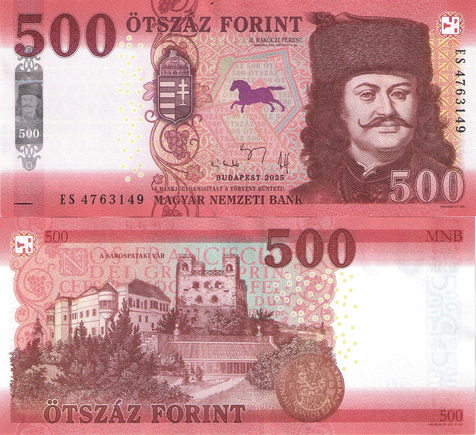 Лицевая сторона: в правой части расположен портрет князя Трансильвании Ференц II Ракоци, руководитель антигабсбургской национально-освободительной войны венгерского народа 1703–1711 годов. В верхней части номинал: "500 OTSZAZ FORINT". Еиже надпись: "BUDAPEST 2025" и подписи управляющих.