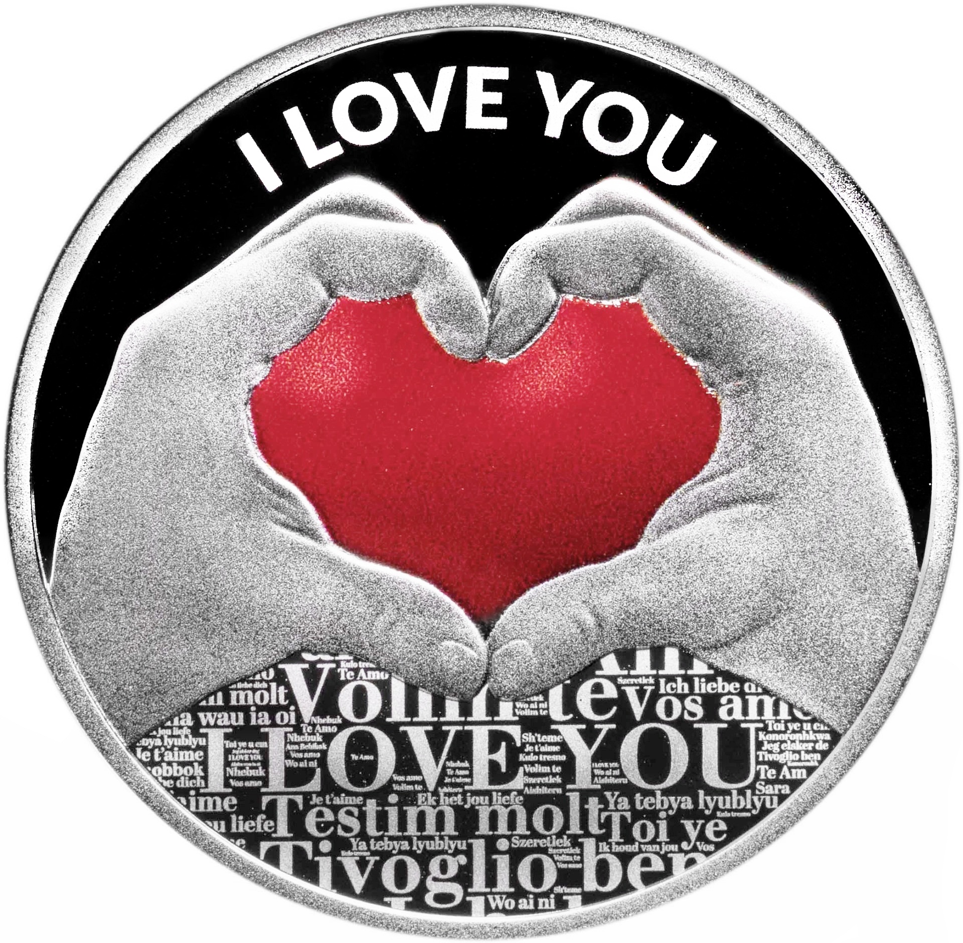 Реверс: по центру сердце, изображённое в виде двух соединенных рук, и фраза «Я люблю тебя» на разных языках. Сверху надпись на английском языке: "I love you".