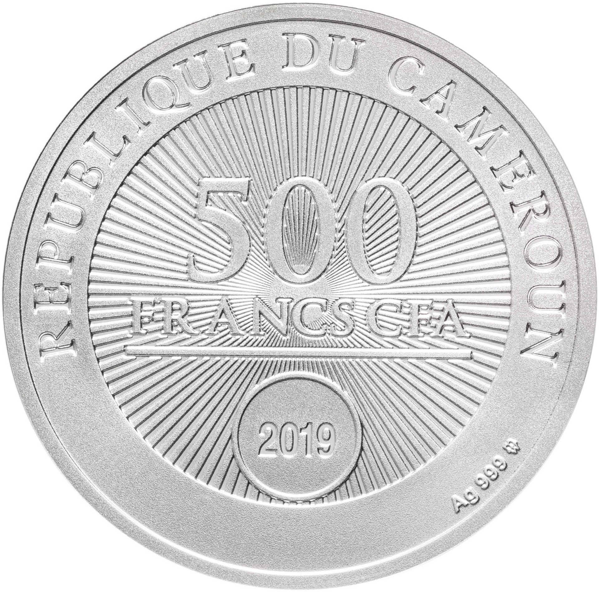 Аверс: в центре монеты номинал и год чеканки: "500 FRANCS CFA / 2019". Сверху надписи: "REPUBLIQUE DU CAMEROUN".