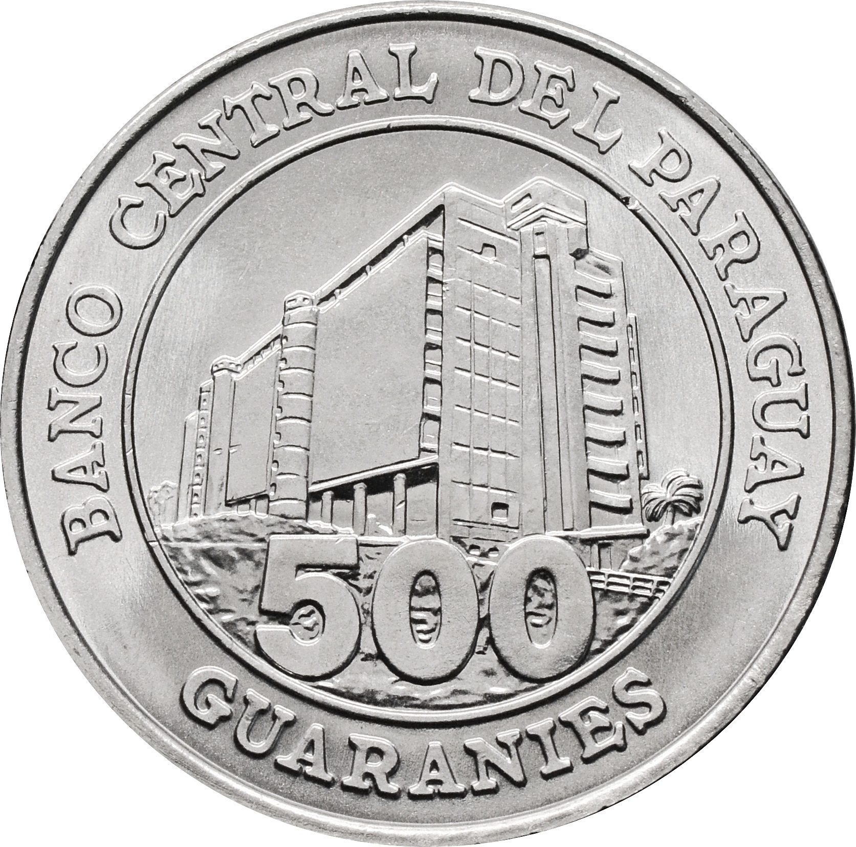 Реверс: прямо по центру изображено здание. Ниже указан номинал монеты: "500 GUARANIES". Сверху содержится надпись: "BANCO CENTRAL DEL PARAGUAY".