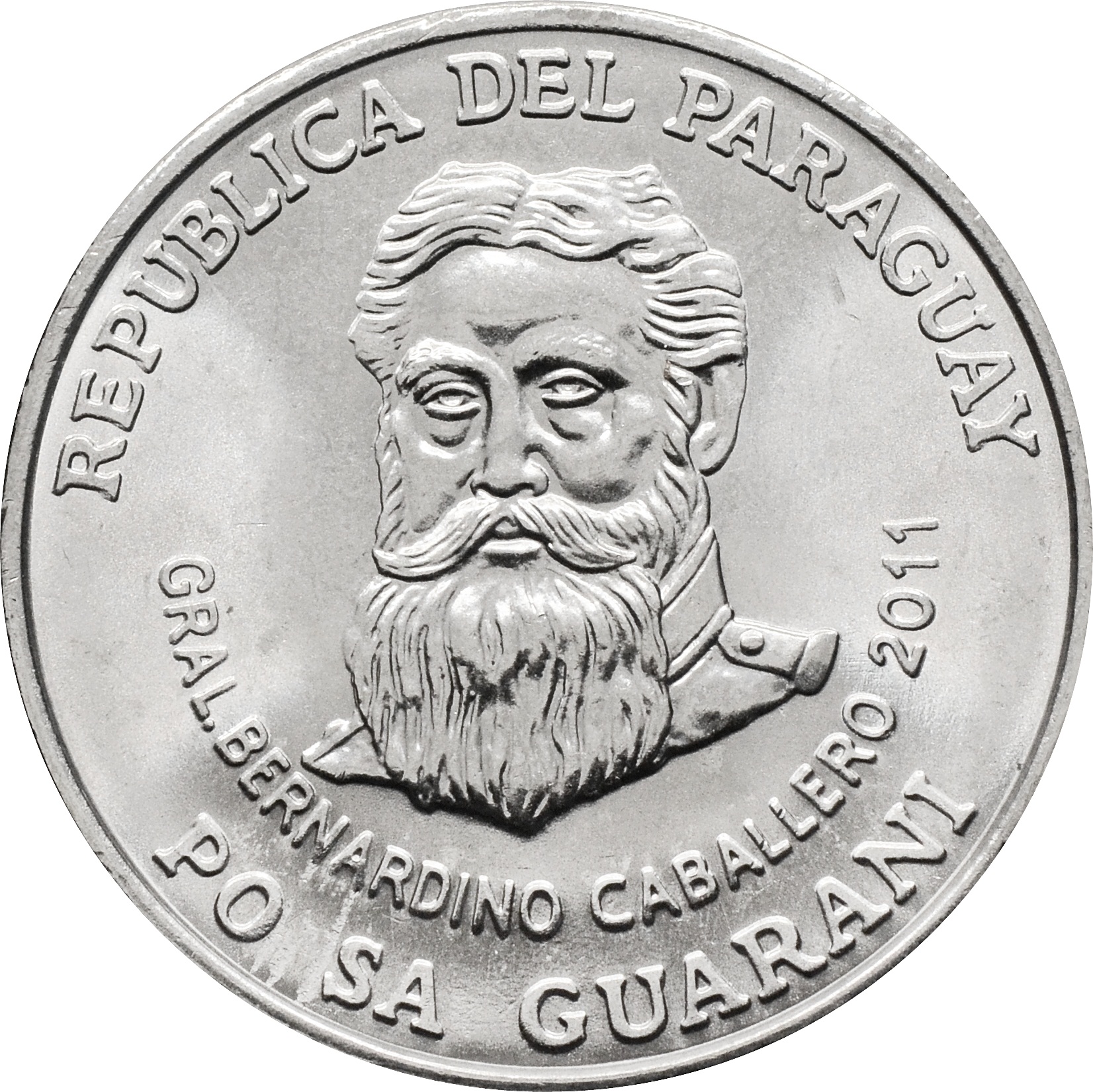 Аверс: в центре расположен портрет парагвайского государственного и политического деятеля, президент Парагвая. Ниже подпись: "GRAL. BERNARDINO CABALLERO" и год чеканки: "2011". В самом низу номинал: "PO SA GUARANI", а сверху надпись: "REPUBLICA DEL PARAGUAY".