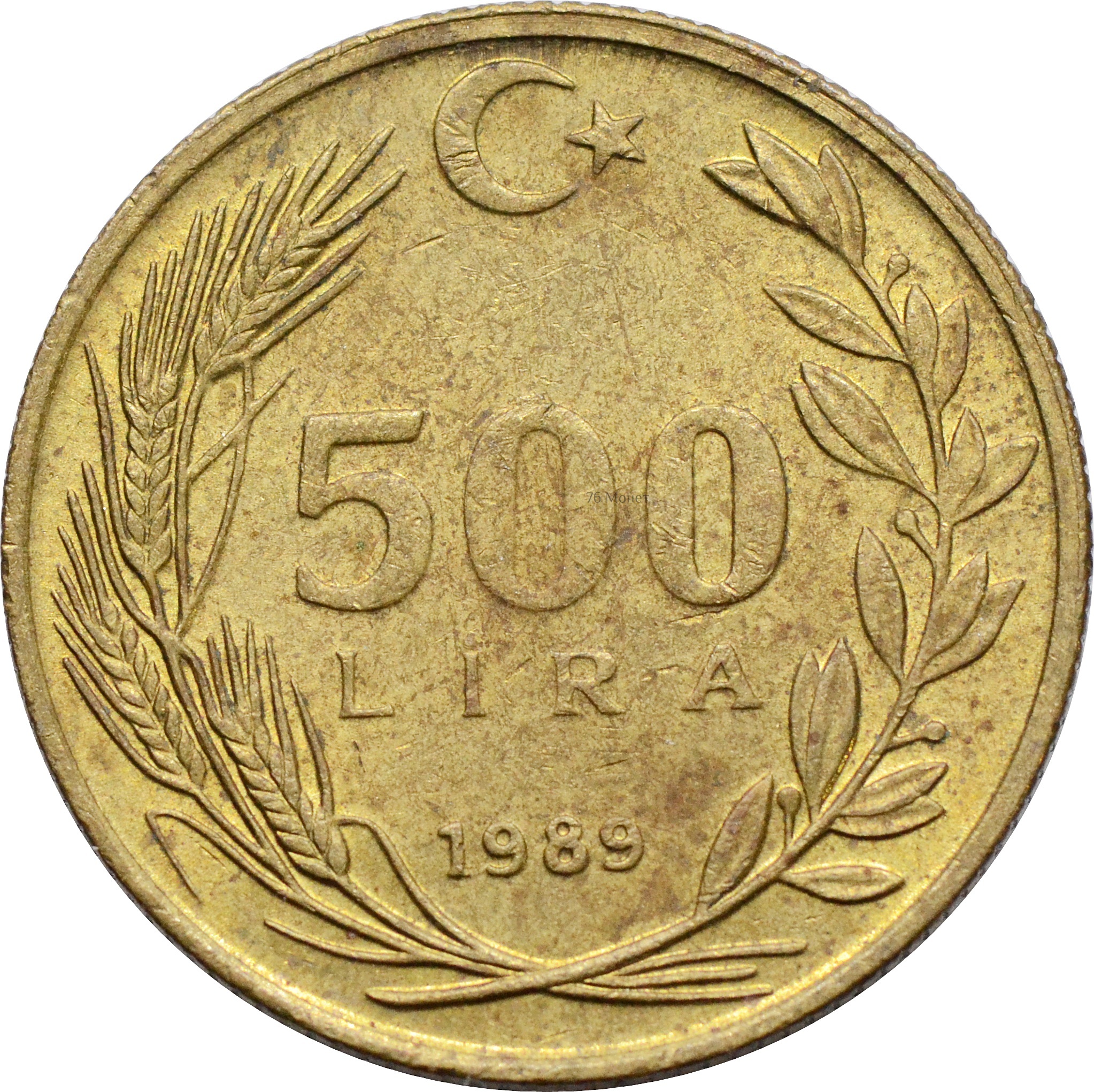 Реверс: в центре указан номинал в две строки: "500 LIRA", ниже год чеканки монеты: "1989". По бокам колосья пшеницы образуют импровизированный венок, вверху которого изображен полумесяц со звездой - герб Турции.